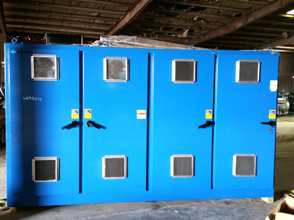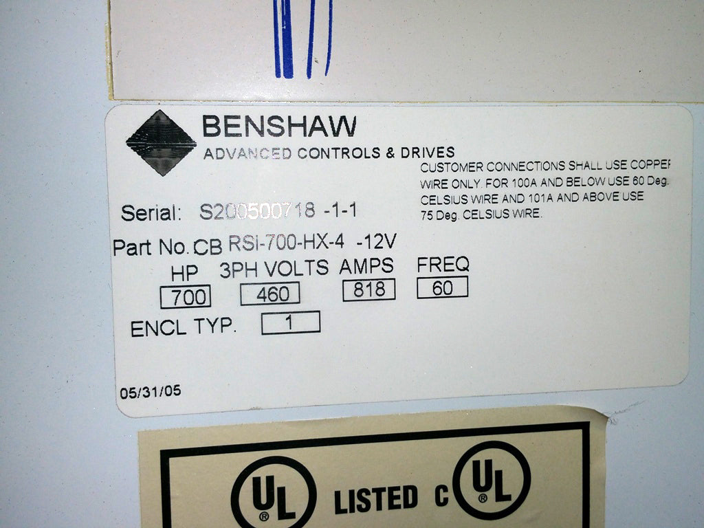 Benshaw VFD Motor Controller. Made by Benshaw Advanced Controls and Drives. Serial: S200500718-1-1. Part: CB RSI-700-HX-4-12V. Specs: 700 HP, 460V 3-phase, 818 amps, 60 Hz, enclosure type 1. Previously used with a rotary screw compressor in a refrigerant application running a 700 HP Premium Efficiency Motor. SSD Drives 690+ Series. Overall dimensions: 28 in. W x 160 in. L x 99 in. H.