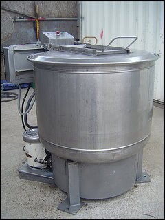 Bock Engineered Products, Inc. FP-90 Centrifuge. Model: FP90. Approximate wet capacity: 1950 lbs. per hour or 130 lbs. dry. 2 ft. 11 in. dia. x 1 ft. 7-1/2 in. straight wall. Leeson motor: 5 Hp, 1760 rpm, 208-230/460 V, 13/6.5 A, 60 Hz, 3 Phase. Allen Bradley Variable Frequency Drive: Cat no. 22B-D010N104 with emergency stop button. The FP-90 is a batch centrifuge system used for removing retained rinse water from leafy products and root vegetables such as lettuce, cabbage and spinach. (1) 3 in. port outlet. Overall dimensions: 4 ft. 5-1/2 in. L x 3 ft. 9 in. W x 4 ft. 1-1/2 in. H.(ACN227a).