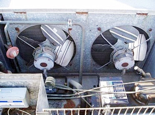 1993 Bohn Condensing Unit. Model: DLH5H2ED. S/N: D93H37469. Nominal fin spacing: 9 fpi. Design pressure (hi): 350 psi. Copeland 2-Cylinder Reciprocating Compressor, Model: 2DC3-0500-TFC, S/N: CT 93F 04324, 200/220-208-230 V, 22.3 RLA, 120 LRA. 50/60 Hz, 3 phase. The 2DC3-0500-TFC compressor is rated for 5 HP and medium temperature R502 or medium-high R22. Dual fan setup with (4) blades per fan. Fan blade size: 9 in. W x 6 in. W. (2) Emerson Fan Motors, 1/4 hp, 1.8 amps, single phase. Inlets: (1) 1 in. inlet port. Outlets: (1) 1/2 in. outlet port. Overall dimensions: 48 in. L x 36 in. W x 33 in. H.(ACN65).