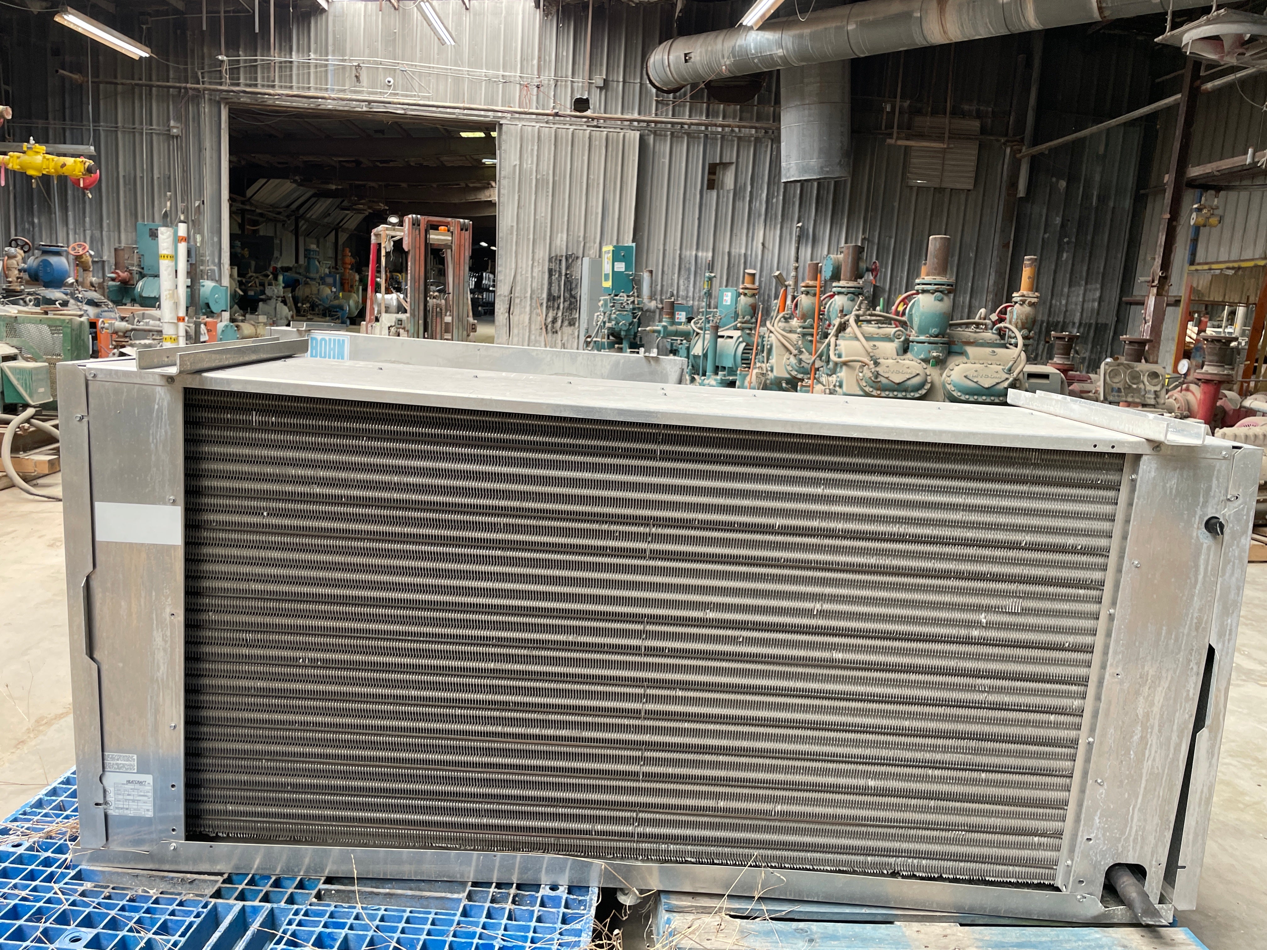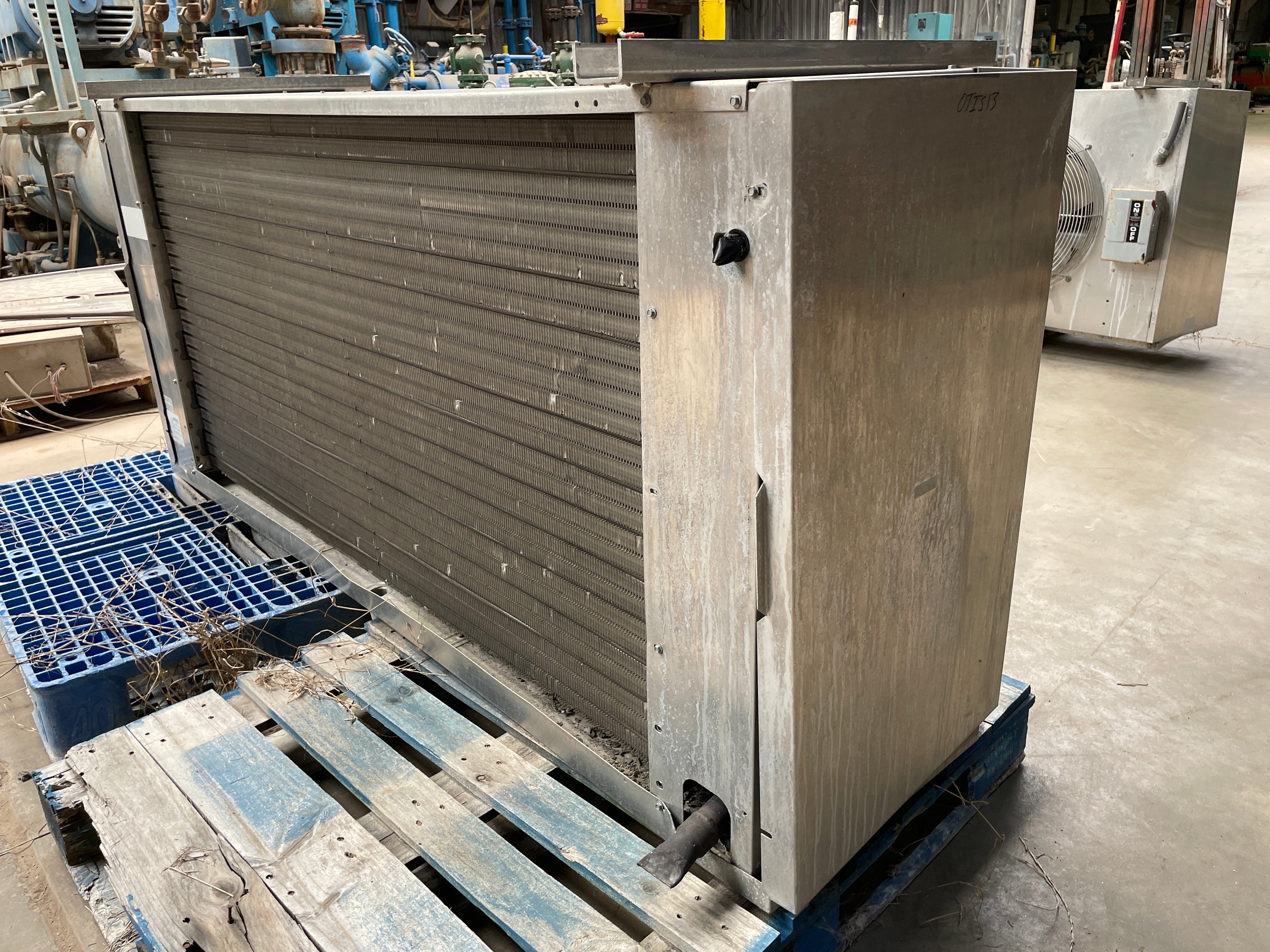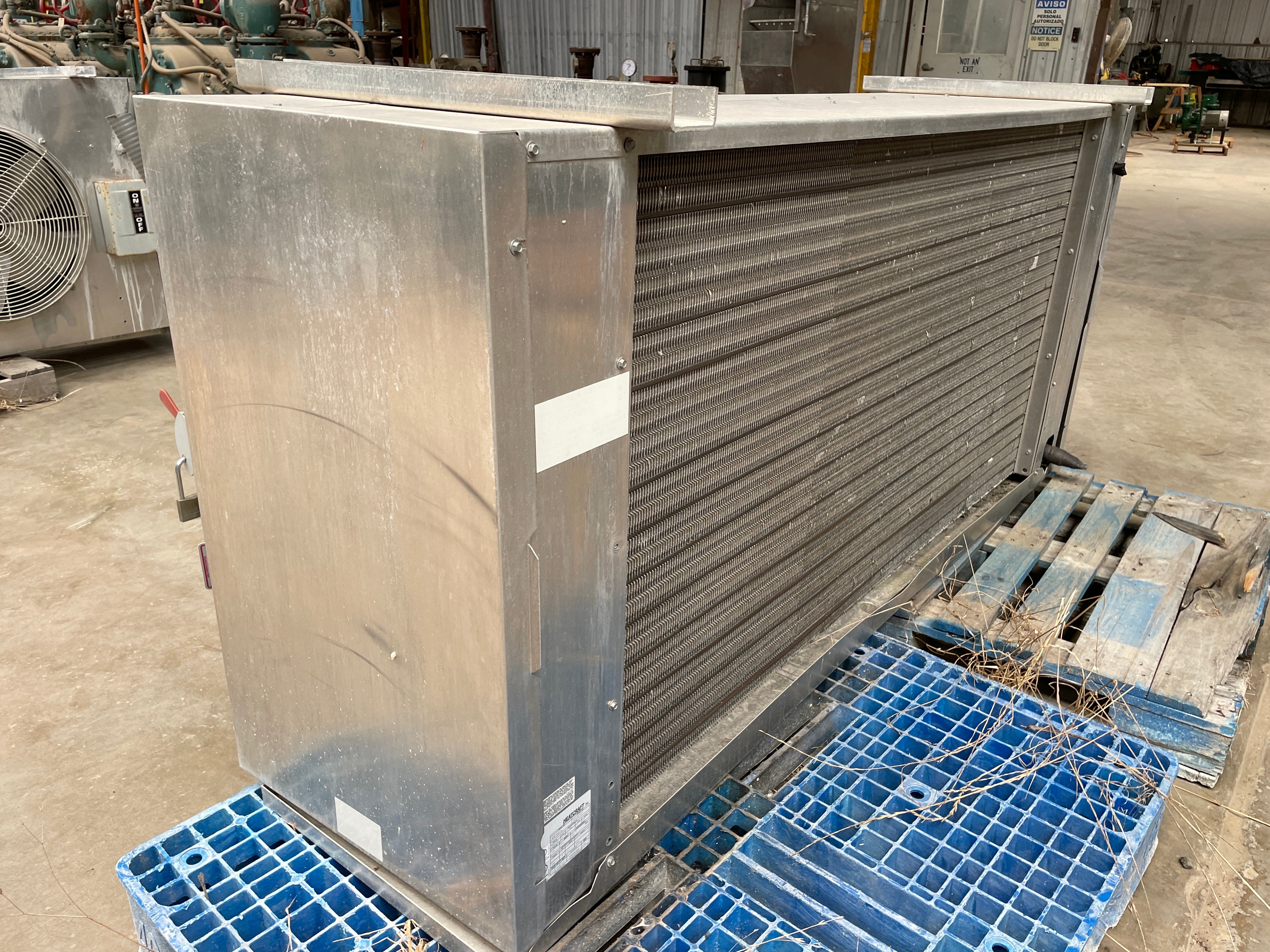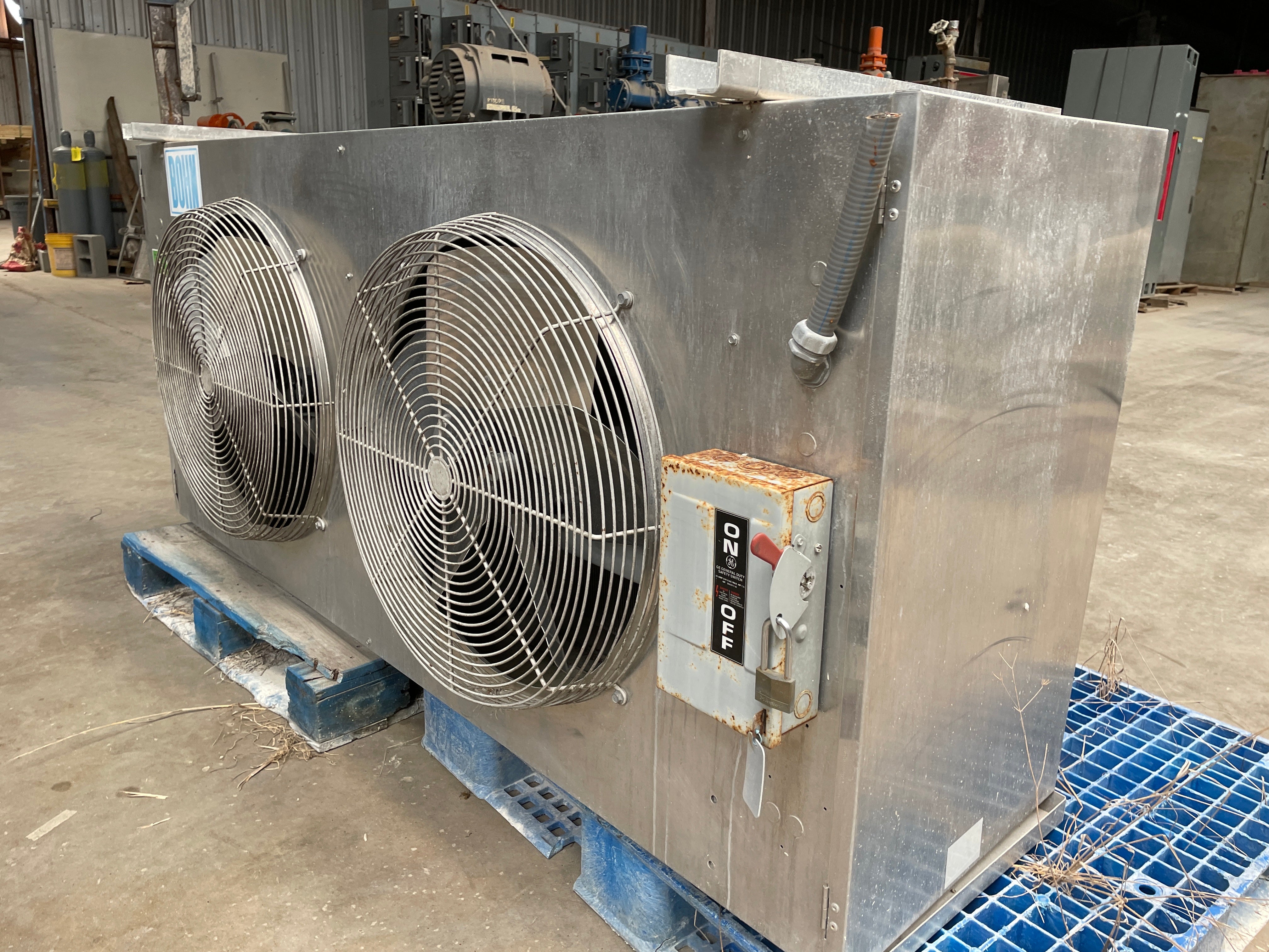 Bohn (Heatcraft) BHL480CA Freon Evaporator Coil- 4 Ton, 2 Fans (Low Temperature) Serial No: D01D03967. Frosted coils with a capacity of 4800 (BTUH / °F TD) and a tonnage of 6(TR) @15TD. Air flow of 9400 CRM. Flooded coils with a top feed and electric defrost. 4 fins per inch and 2 Fans. Previously used with Freon.