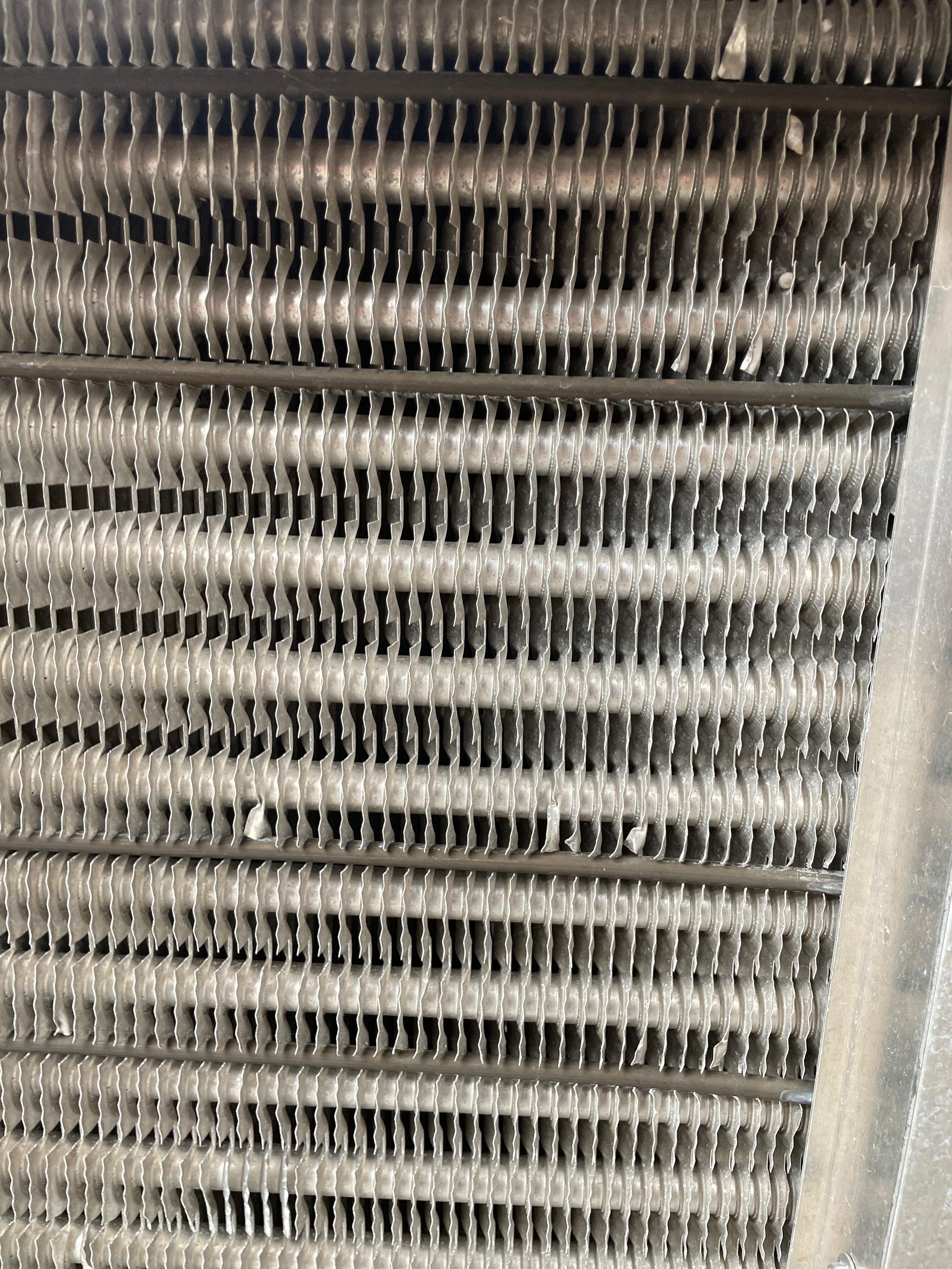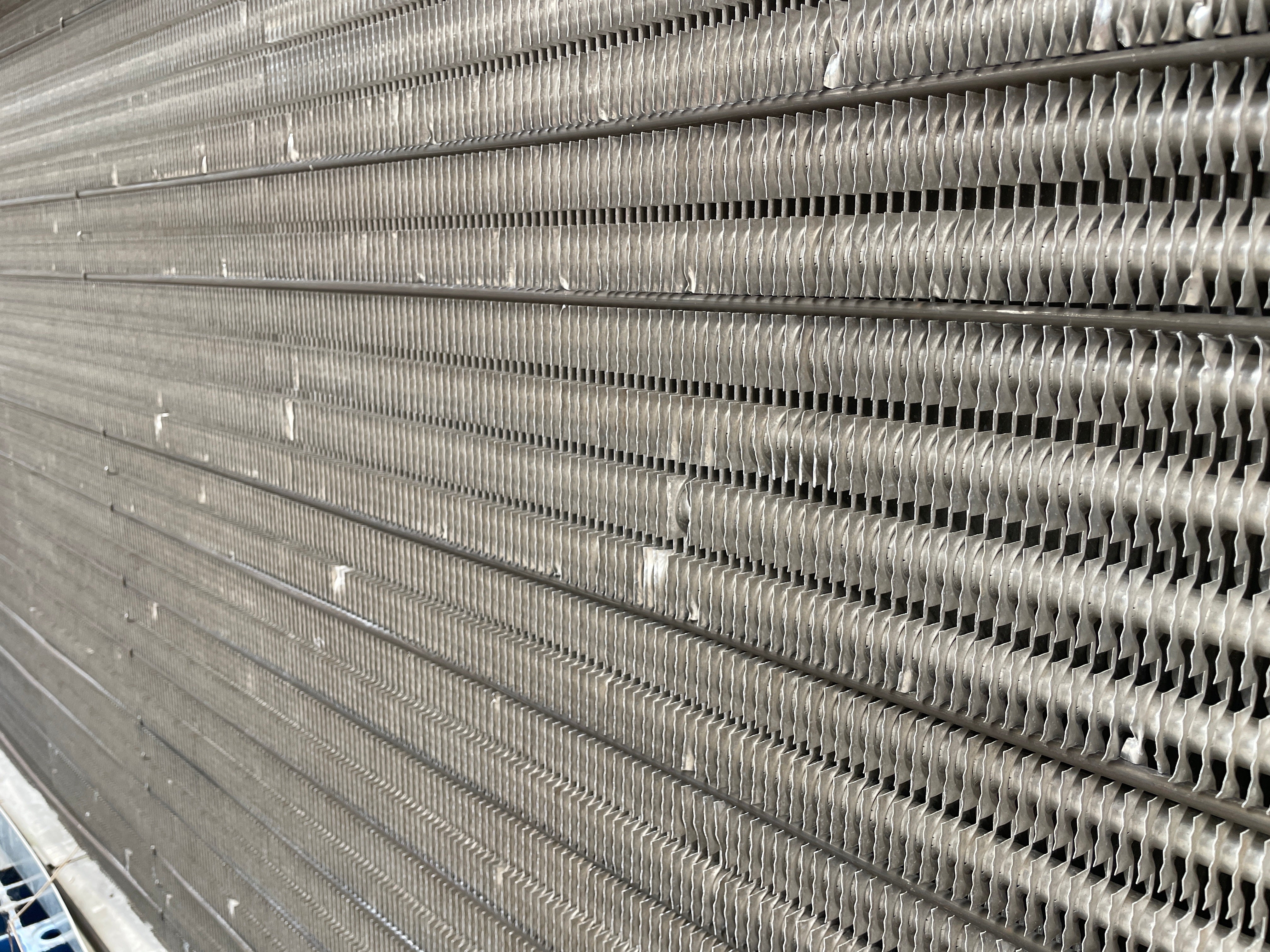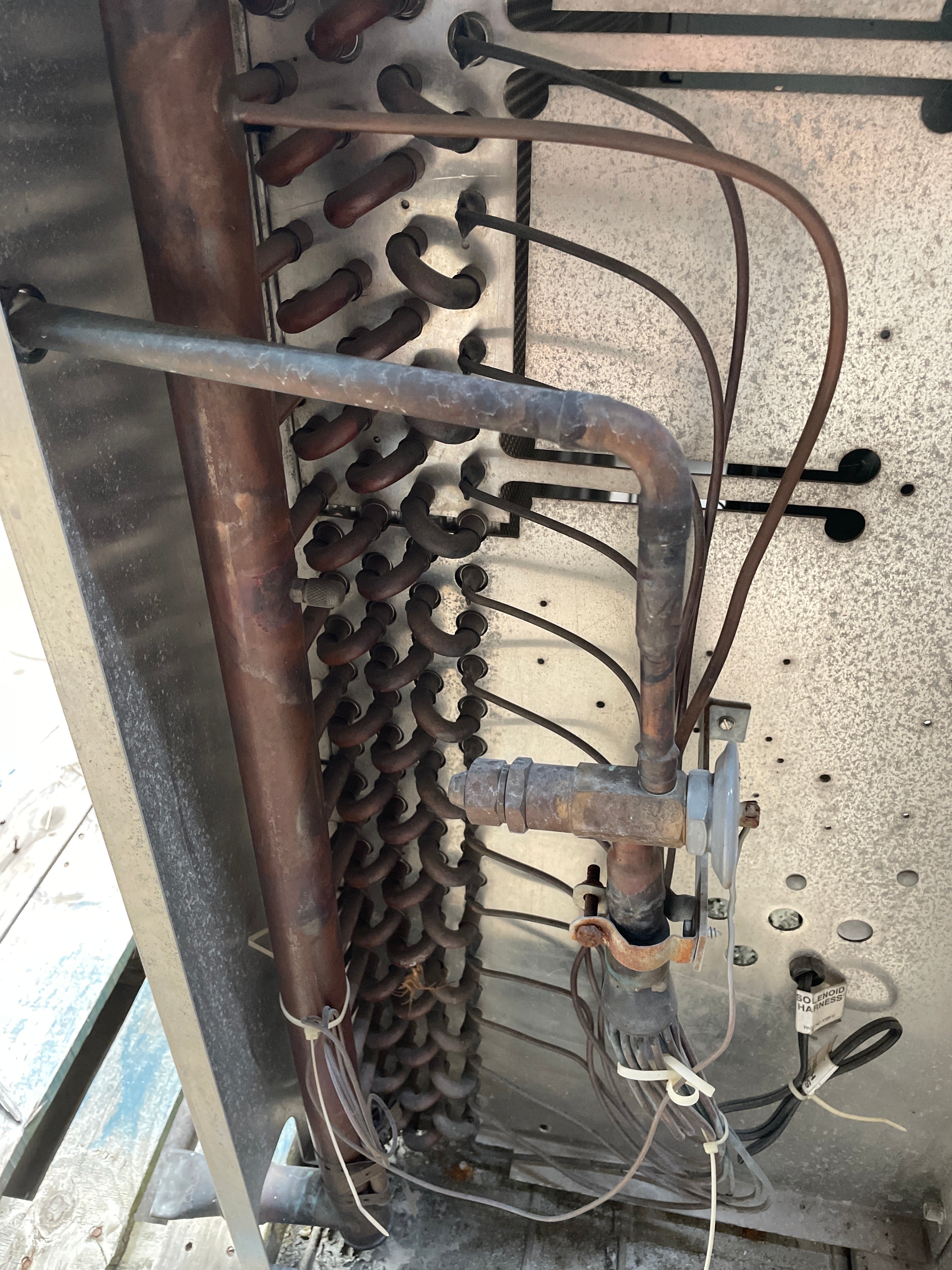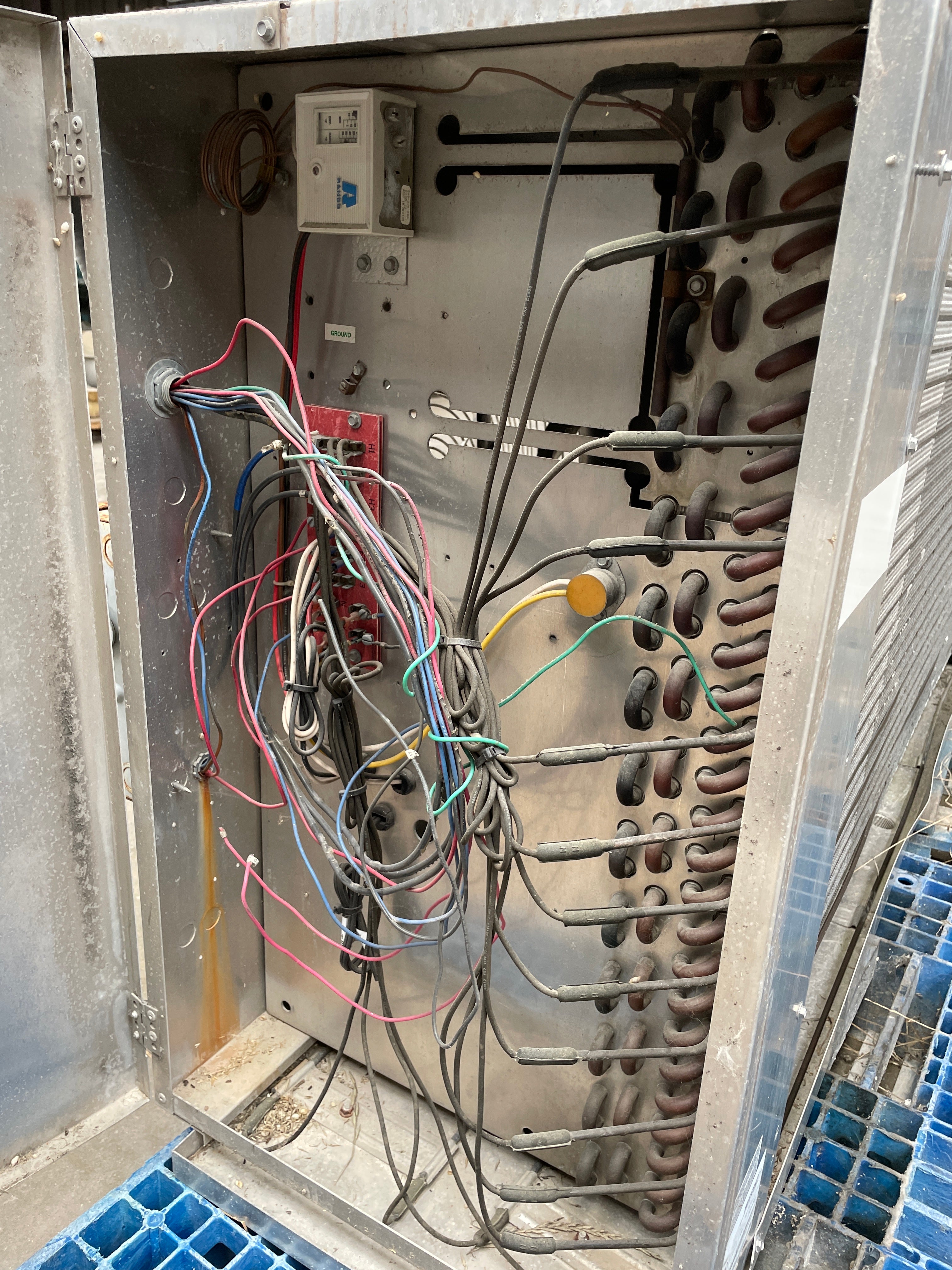 Bohn (Heatcraft) BHL480CA Freon Evaporator Coil- 4 Ton, 2 Fans (Low Temperature) Serial No: D01D03967. Frosted coils with a capacity of 4800 (BTUH / °F TD) and a tonnage of 6(TR) @15TD. Air flow of 9400 CRM. Flooded coils with a top feed and electric defrost. 4 fins per inch and 2 Fans. Previously used with Freon.
