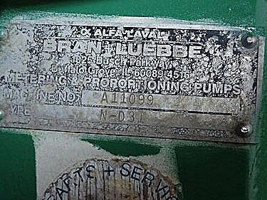 Bran+Luebbe Metering Pump. Model: N-D31. S/N: A11099. Reliance Electric Motor, 5 hp, 1730 rpm, 230/460 V, 14/7 amps, 60 Hz, 3 phase. Variable Speed Drive, 60 rpm (max). (2) 2 in. dia. I-line fittings. Overall dimensions: 41 in. L x 19-1/2 in. L x 33 in. H.