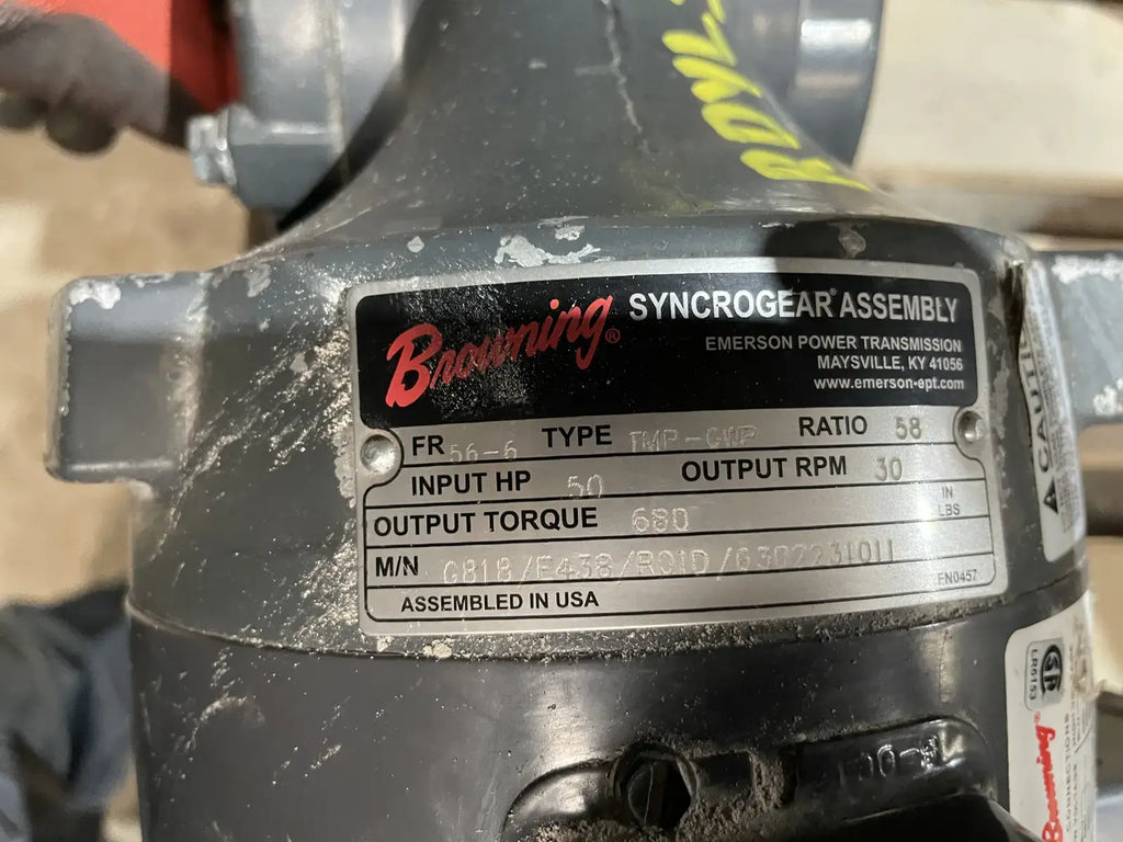 Browning Center Pivot Worm Gear Motor. Type: MP-CWP. Frame: 56-6. Ratio: 58. Input Hp: 50. Output RPM: 30. Output Torque: 680 lBS.