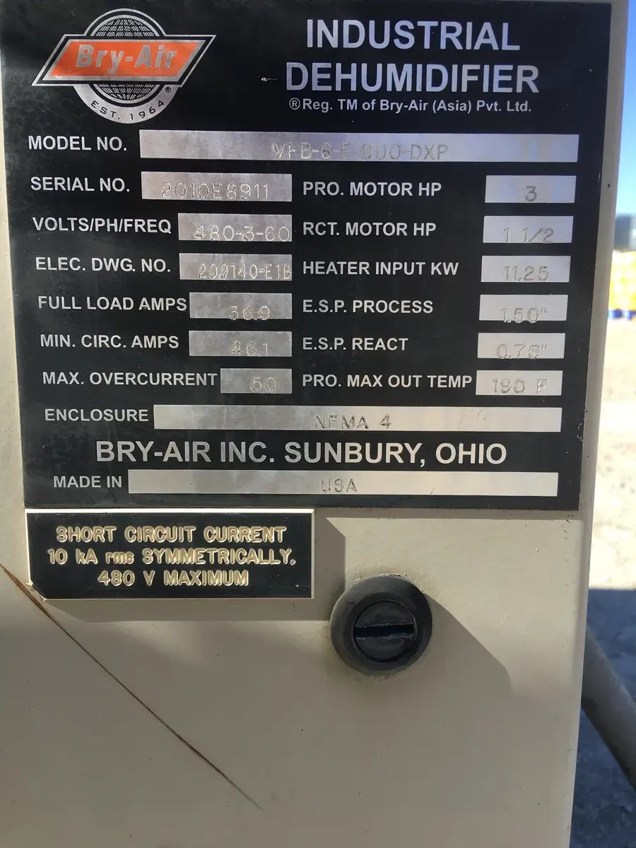 Bry-Air VFB Series Dehumidifier Industrial Dehumidifier. Model: VFB-6-E-800-DXP. Serial No: 2010E8911. Lecture Drawing No: 209140-E1B. Minimum Circuit Amps: 46.1. Max Overcurrent: 50. Volts/PH/Freq: 480/3/60. Pro.Motor HP: 3. RCT. Motor HP: 1.5. Heater Input(KW): 11.25. Pro.Max Out Temperature: 190 F. Enclosure: NEMA 4. Process CFM: 600. Process External Static: 1.50 w.c. React CFM: 200. React External Static: 0.75 w.c.