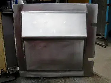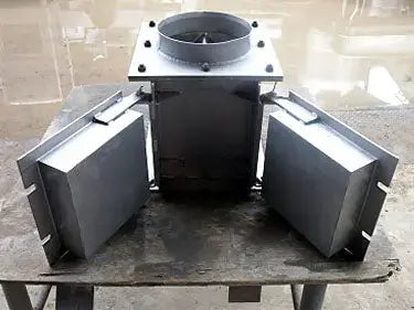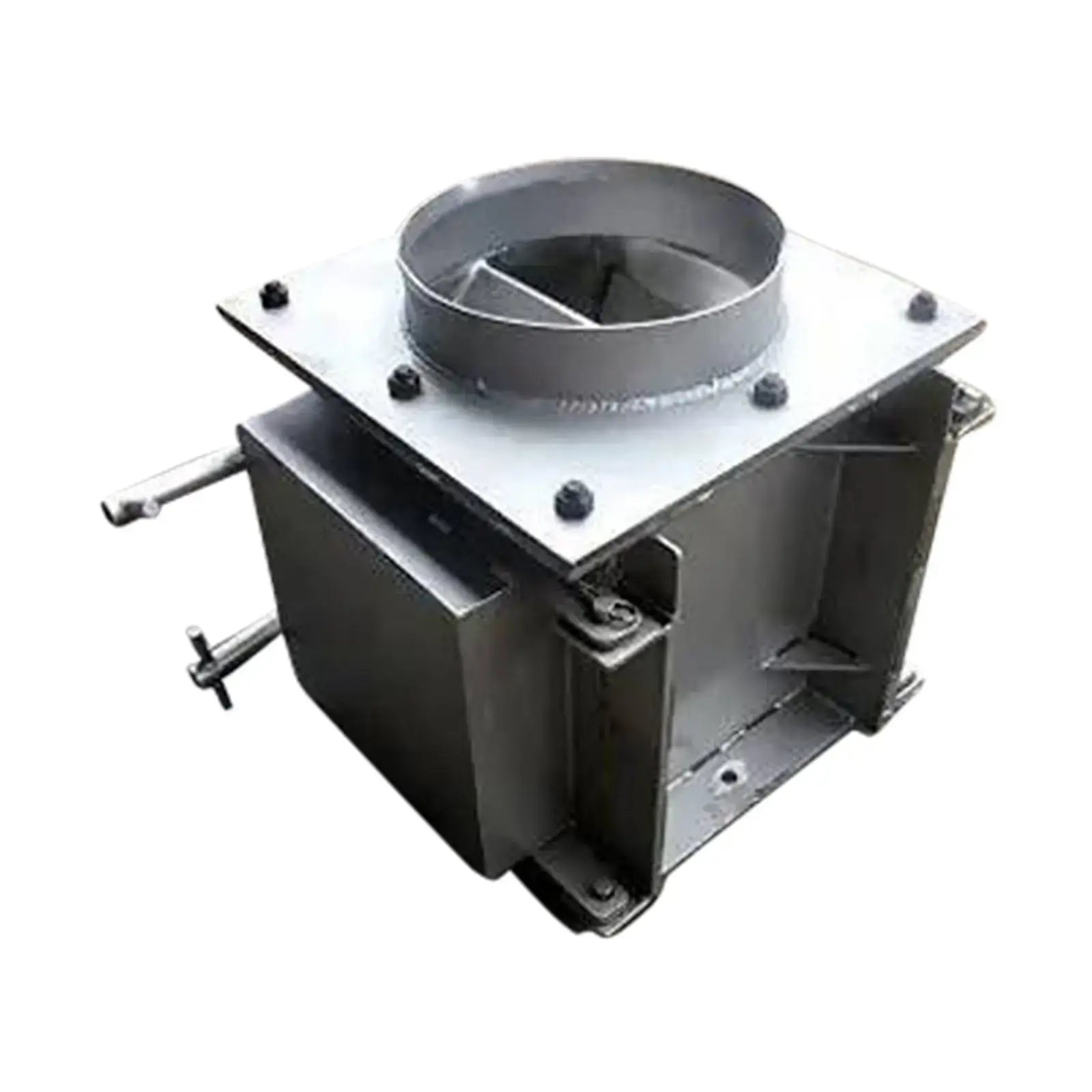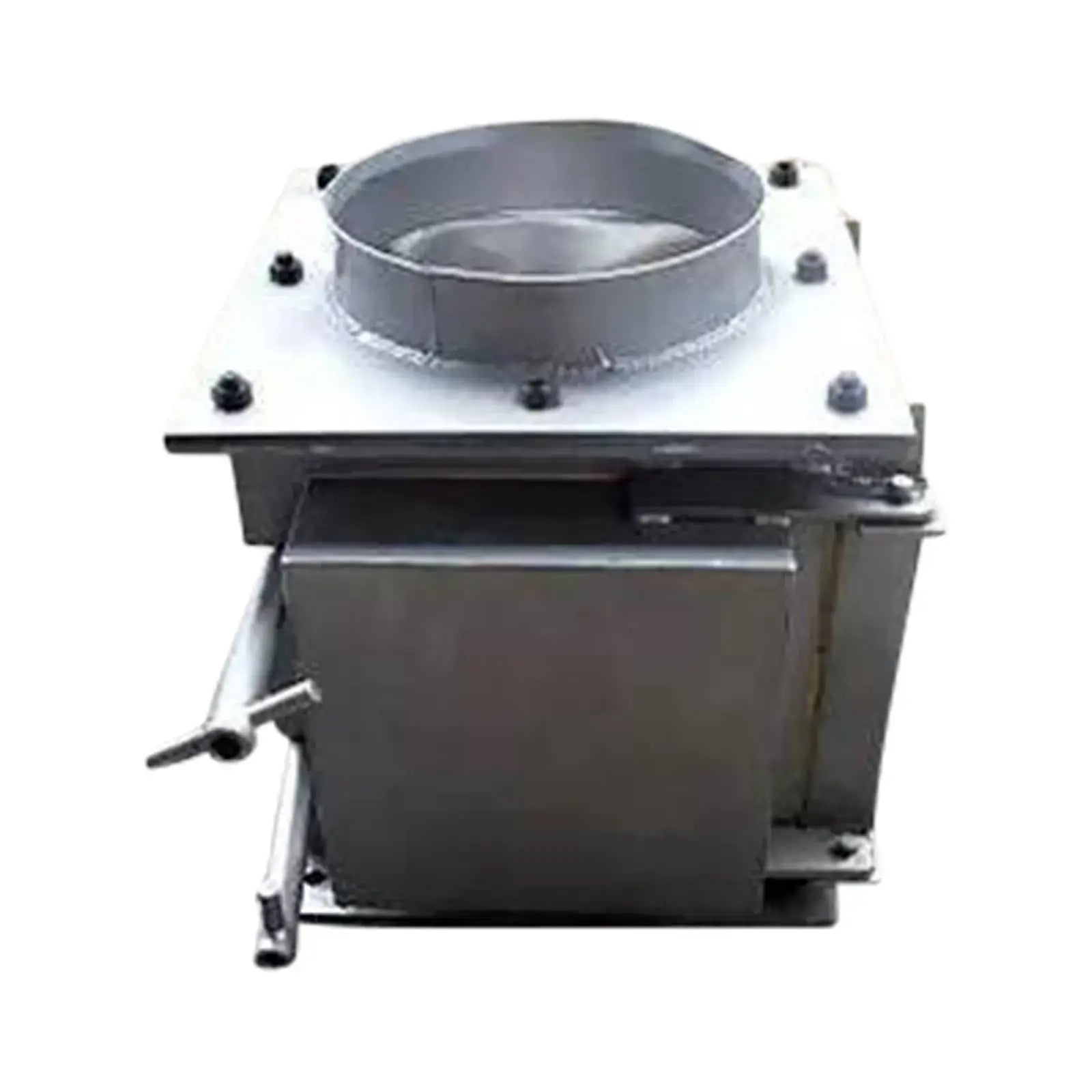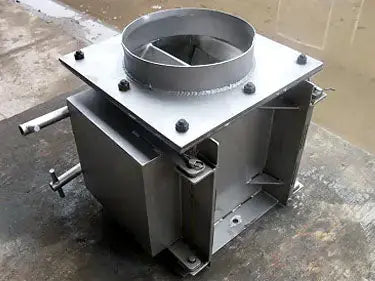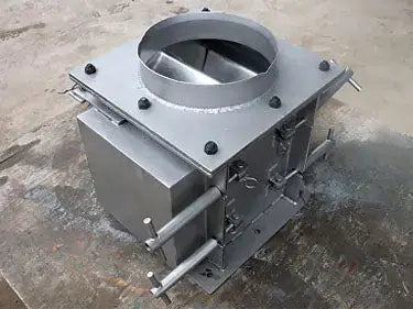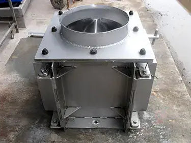 Bunting Magnetics Co. Powder Flow Thru Magnet. (2) Magnetized doors. (1) 8 in. dia. inlet. (1) 8 in. L x 8 in. W outlet. Overall dimensions: 1 ft. 7-5/8 in. L x 1 ft. ¾ in. W x 1 ft. 1-1/2 in. H.