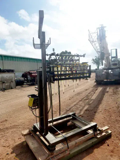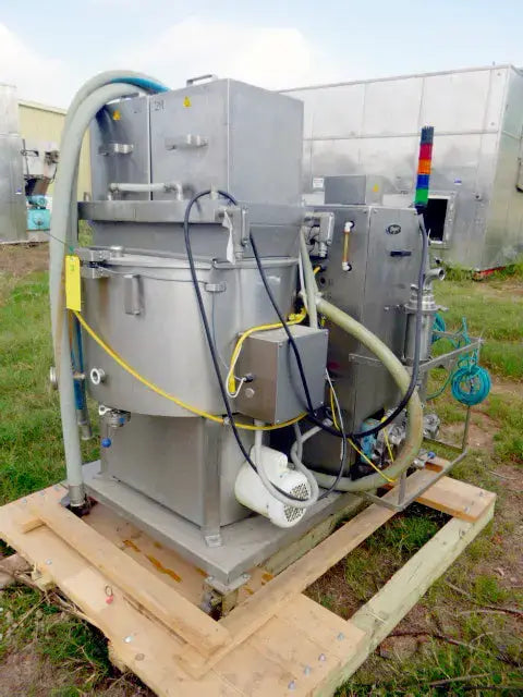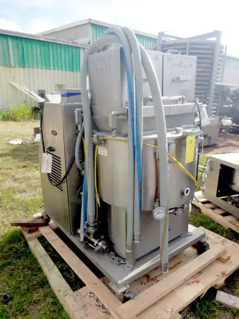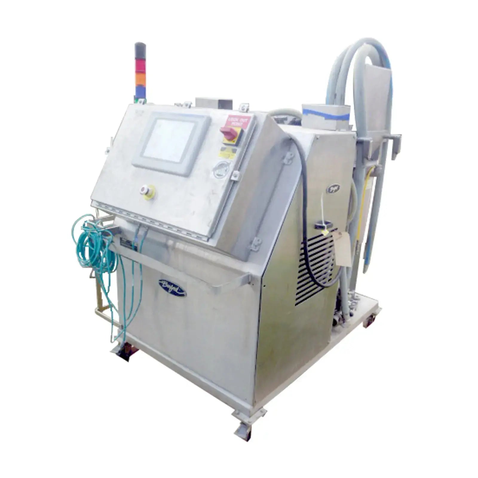 Burford Corporation Sprayer Butter Melter Station. Model: 8830. Serial No: 15990. Air specifications: 2 scfm @ 60 psi. Electrical requirements: 208/220V, 30 amps, 50/60Hz, 1 phase. The Burford Model 8830 Oil and Butter Applicator has been designed to spray a controlled amount of product into empty pan cavities on a two rail assembly without interruption to pan flow by utilizing sensors and PLC controls to activate applicator nozzles to spray as each pan passes. Features ethernet connections, Allen-Bradley PowerFlex 4 AC drives, and a SOLA power supply. Overall dimensions: 5 ft. L x 5 ft. 5 in. W x 4 ft. 1 in H.