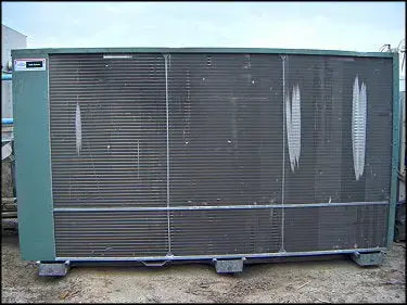 Carrier Air-Cooled Condenser. Nominal capacity: 80 tons. Model: 09DE084510. Fan motors: (4) 0.75 NEC HP, 200 V, 1 phase, 60 Hz, 7.7 FLA and (2) 0.66 NEC HP, 200/230 V, 1 phase, 60 Hz, 6.2 FLA. Overall Dimensions: 13 ft. L x 7 ft. 2 in. W x 7 ft. 5 in. H.(H15)(ACN166).