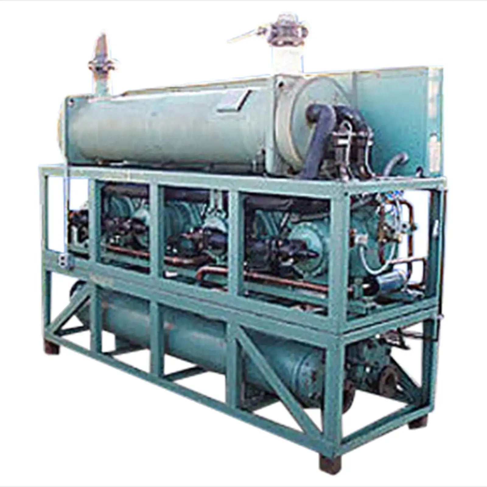 1992 Carrier Water Cooled Chiller. Model: 30HR120-E620. Rated capacity: 120 tons. Refrigerant: R-22. Capable of chilling Glycol to 15°F. Design/test pressure (hi/low): 385/235 psig. Power supply: 460 V, 3 phase. (2) 1995 Carrier shell & tube exchanger. Model: 09RP070-289. MAWP: 385 psi @ 150°F. MDMT: 32°F @ 385 psi. 1995 Carrier chiller barrel. Model: 10HA401-694. MAWP: 235 psi @ 150°F. (4) Carlyle compressors: M/N(s): 06EF175310, 208-230/460 V, 3 phase. Inlets: (1) 6 in. dia. port, (1) 1 in. dia. port. Outlets: (1) 4 in. dia. port, (1) 1/2 in. dia. port. Overall dimensions: 9 ft. 6 in. L x 3 ft. W x 8 ft. 3 in. H. (ACN455).