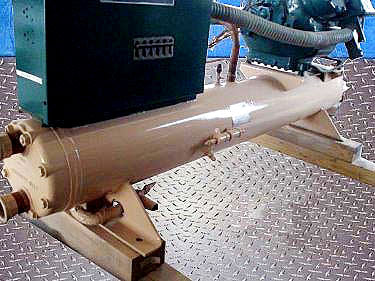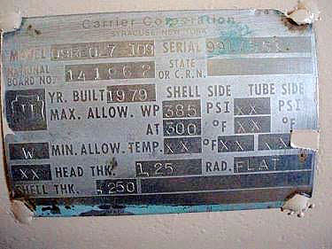Carrier Water-Cooled Condensing Unit - 30 Ton. Model: 07EB033410. S/N: D960421. Test pressure: 385 psi. Carrier Condenser, Model: 09RE027-109, S/N: 9917551, Nat'l Bd: 141962, shell side MAWP: 385 psig @ 300 °F, head thickness: 0.125 in., shell thickness: 0.250 in., radius: flat. We have successfully pressure tested the condenser at 120PSI to check for pressure loss (leaks). Carlyle 6-Cylinder Semi-Hermetic Reciprocating Compressor, Model: 06EX275560B, S/N: 2081PE7262, design pressure (hi/lo): 450/315 psi, 1800 rpm, 200 V, 506 LRA, 60 Hz, 3 phase. Inlets: (2) 2 in. dia. NPT fittings (liquid). Outlets: (1) 2-1/2 in. dia. NPT (liquid). Overall dimensions: 86 in. L x 25 in. W x 38 in. H.(H11)(ACN180).