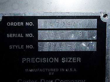 Carter-Day Company Precision Sizer. Model: ACA9-X. S/N: 101 87. Order No: E-7294Y. Infeed hopper dimensions: 11 in. W x 6 in. H. Leroy Somer PowerBlock motor with drive, 0.33 hp, 1725 rpm, 200-230/460 V, 1.46-1.5/0.73 amps, 60 Hz, 3 phase. The Carter-Day sizers have the performance efficiencies and capacities for many sizing/separating requirement for seed corn, sunflower, barley, wheat, oats, rice, shelled peanuts, soybean and most other free flowing granular material. Inlets: (1) 3 in. dia. port, (1) 4 in. W x 2 in. H infeed. Outlets: (1) 5 in. W x 4-1/2 in. H discharge chute. Overall dimensions: 7 ft. 3 in. L x 1 ft. 10 in. W x 2 ft. 11 in. H.(H14)(ACN72).