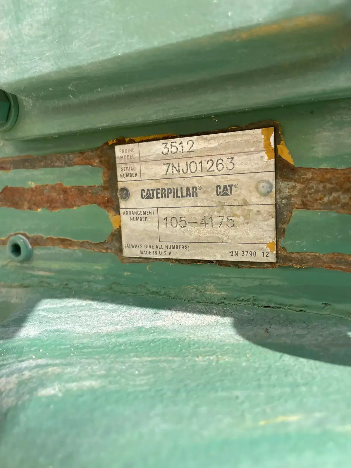 CAT 3512 Industrial Gas Engine. Model: 3512. Serial No: 7NJ01263. Arrangement Number: 105-4175. Fuel: Natural Gas. Engine Speed: 1200 RPM. Max Hp: 780.