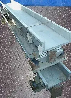 CCM Rigidized Shaker Stainless Steel. Model 30-0-18-6. S/N N93222012. 18 in. W x 6 in. deep. (2) sections: 16 ft. 9 in. and 13 ft. 6 in. Inside dimension: first part, 16 ft. 6 in. L x 18 in. W x 6 in. H. Second part; 13 ft. 5 in. L x 18 in. W x 6 in. H. Motor: Brook crompton, 5 hp, 1730 rpm, 575 V, 5.5 amps, 60 Hz, 3 phase. Incentric drive.