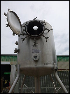 Cherry-Burrell Aro-Vac Flavorizer Tank. To be operated under vacuum. Tank features a tangential inlet, baffled bottom drain, manhole, site glasses, and additional ports. Inside diameter: 47.625 in. Straight-wall height: 48 in. Estimated internal tank volume: 370 gallons (these are not operated at full tank levels).
