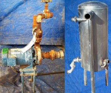 Cherry Burrell Stainless Steel Flavorizer ARO-VAC Model AVA-SC, S/N 321, w/ Goulds Centrifugal Pump. Model 3642, index 25F22034. No motor info. (1) 2 in. to pump outlet, (1) 2 in. bottom drain, (1) 1-½ in. top inlet, (1) 2-½ in. top side inlet. Tank dimensions 14-½ in. Diameter, 38 in. Depth. Motor pump dimensions 19 in. W, 23 in. L, 32 in. H.