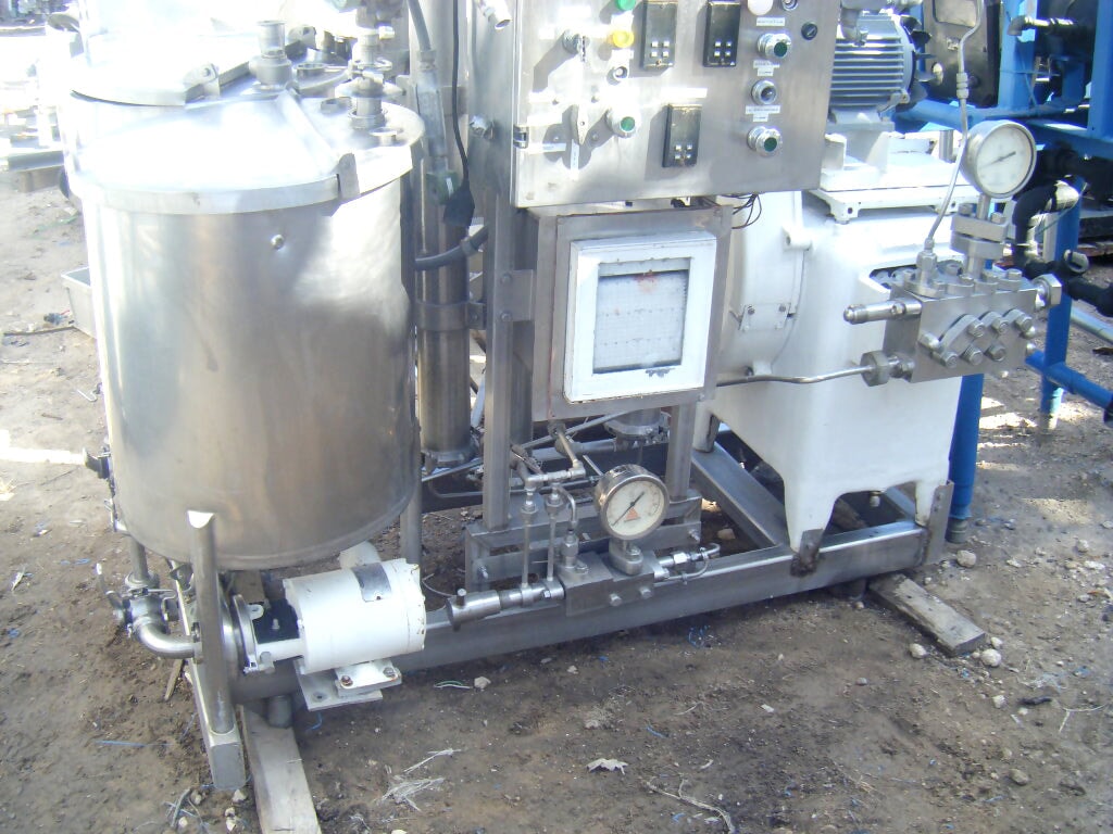 Cherry Burrell Homogenizer. 1.5 hp. Plungers: 1-5/8 in. Agitator: 29 rpm, 20-40 gph, .25 hp, 110 V, 1 phase control, 220 V, 3 phase. High pressure pump: 300 psi max.