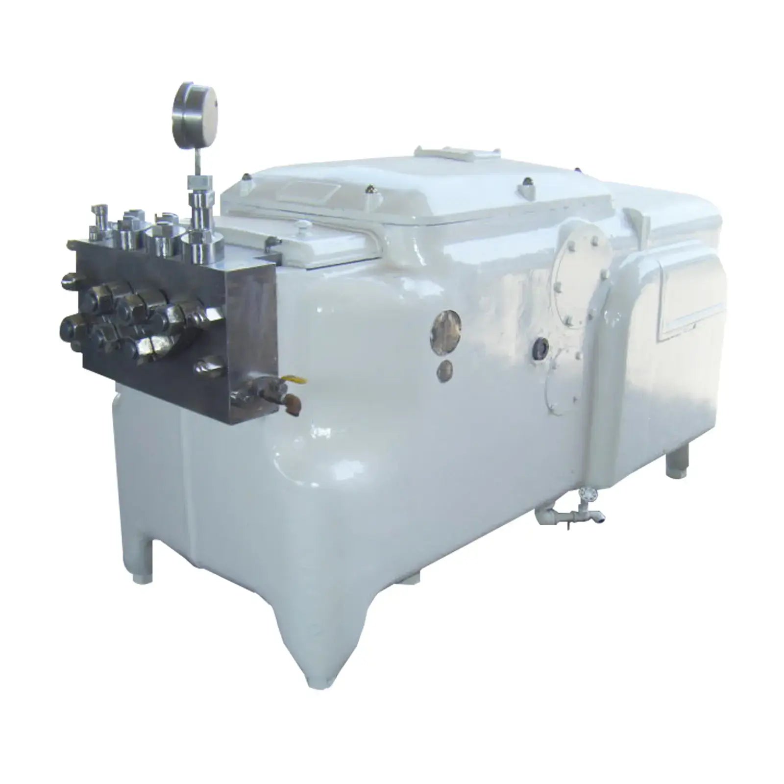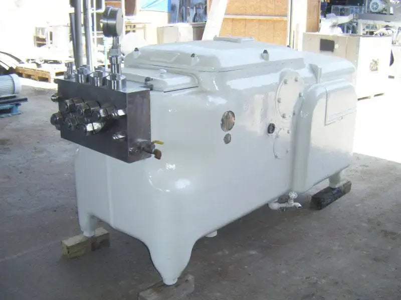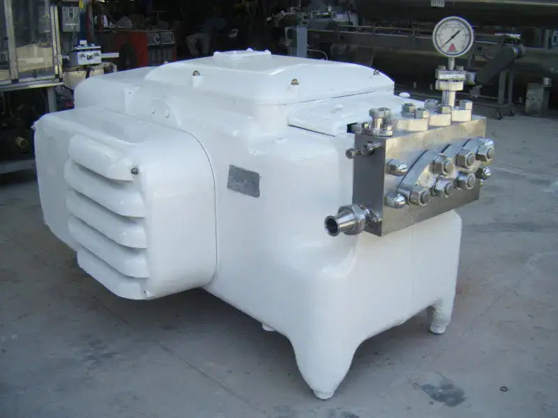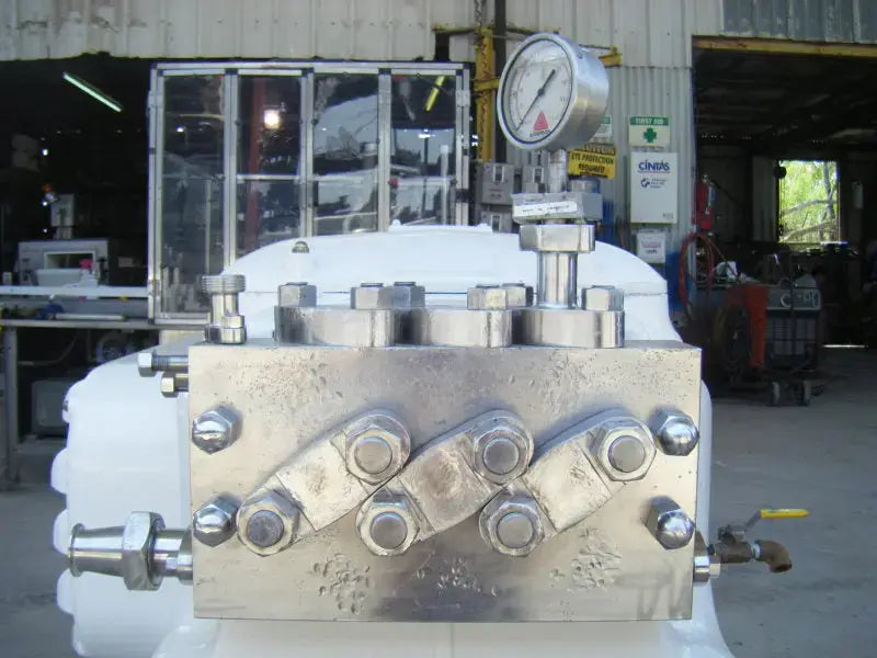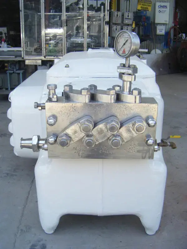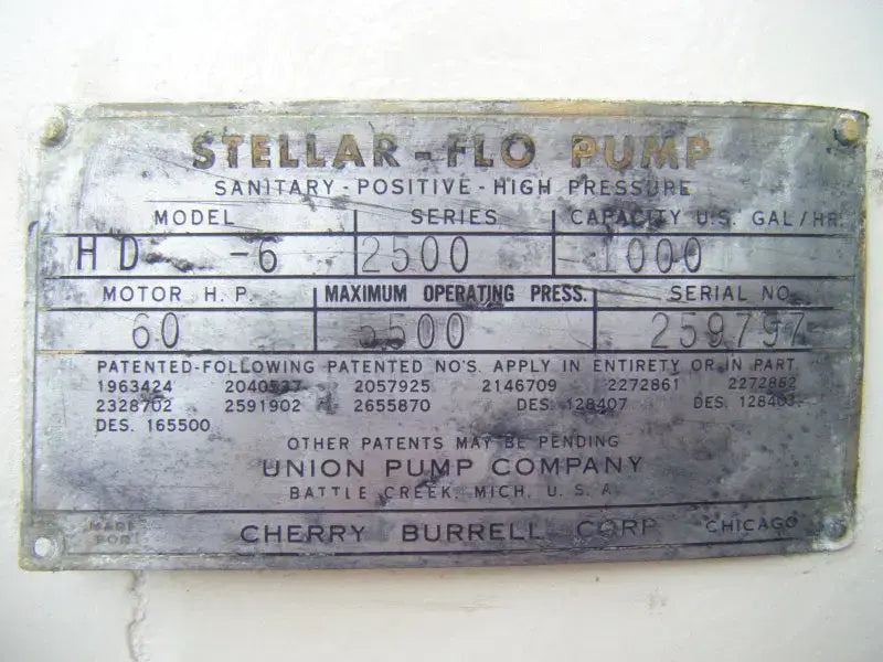Cherry Burrell Stellar-Flo 2500 Series Homogenizer. Model: HD-6. Capacity 1000 gph Maximum Operating Press. 5500 psi. Pressure and flowrate can be modified/adjusted to suit your needs. Currently setup as a pump, but homogenizing valve(s) can be added. Tapered seat ball valves. Plunger size diameters 1-7/8 in. One stage valve. 316 stainless steel contact surfaces. Inlets /outlets (1) 2 in. s-line. (1) 1 in. acme. (1) 5/8 in. shut on/off American valve. (1) Anderson gauge. US motor: 60 Hp, 1500/1800 rpm, 220 volts, 147/147 amps, 50/60 Hz, 3 phase. Overall dimensions: 6 ft. 11-1/2 in. L. x 4 ft. 1 in. W. x 4 ft. 4 in. H.