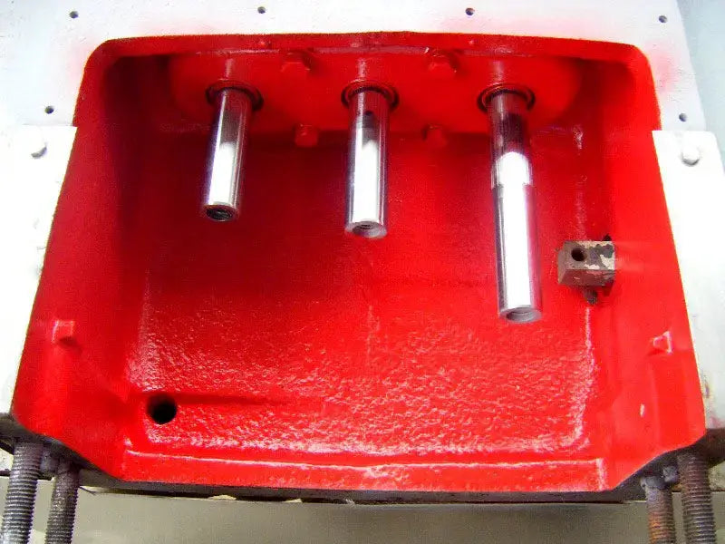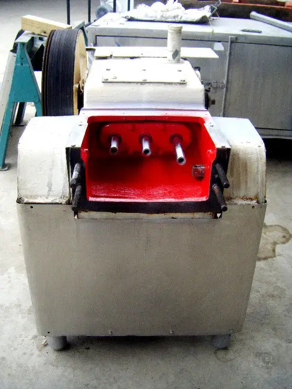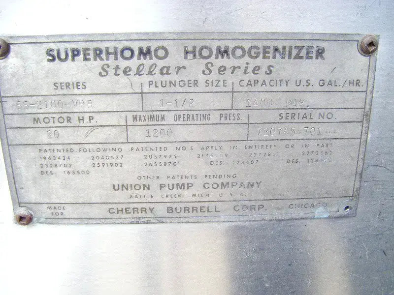 Cherry Burrell Stellar Series High Pressure Pump / Homogenizer. Model: SS-2100-VBR. Capacity: 1400 gallons / hr. Single stage. Plunger Size: 1-1/2 in. diameter. Poppet seat valve cylinders. Maximum operating pressure: 1200 psi. Pressure and flowrate can be modified/adjusted to suit your needs. Leeson electric motor, 40 hp, 3 phase. Driver pulley: 4-1/2 in. dia. Driven pulley: 24 in. dia. Ratio: 5.33. Final rpm: 333. Known as positive displacement or triplex (three piston units), the 2100 series can be used as either homogenizers or high pressure pumps, and feature constant volume delivery regardless of pressure changes on the discharge. Inlets: (2) 2 in. diameter I-Line fitting. Outlets: (1) 1/2 in. discharge staright pipe. Overall dimensions: 4 ft. L x 2 ft. 10 in. W x 3 ft. 11 in. H.(ACN645).