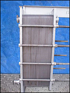 1990 Cherry Burrell ThermaFlex Plate Heat Exchanger. Model: 655SB-2. S/N: 2349. Plate material of construction: 316 stainless steel. Number of plates: 113. Heat transfer surface area: approx. 665 sq. ft. Originally installed in Campbell’s Soup facility. Initially designed to raise the temperature of tomato paste (product) from 35°F to 200°F with a 65 psi pressure drop and a flow rate of 782 lbs/min. The media (water) was reduced in temperature from 215°F to 174°F with a pressure drop of 20 psi and had a flow rate of 300 gpm. Dry weight: 3,275 lbs. Flooded weight: 3,935 lbs. Inlets/outlets: (8) 3 in. dia. I-line fittings. Overall dimensions: 6 ft. L. x 2 ft. 6 in. W. x 6 ft. 5 in. H.