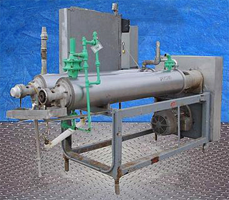 Cherry-Burrell Votator Scraped Surface Heat Exchanger- 6 x 72. Model: 2C672WA. S/N:68-072-1. Concentric shaft and barrel. Contact surface area: 9.0 sq. ft. Votator scraped surface heat exchangers are designed for up to 400 psig @ 375°F product side, and 150 psig @ 375°F jacket side. Pacemaker Motor, 15 hp, 1180 rpm, 413 final rpm, 230/460 V, 41.2/20.6 amps, 60 Hz, 3 phase. The Votator's heat transfer tube provides the necessary thermal conductivity to handle highly viscous products. Tube wall thickness is precisely engineered to minimize heat transfer resistance while maximizing structural stability. Typical applications are heating and cooling cheese sauce, pudding, caRam Industriesel, deboned meat, pet food, and fruit products. Inlets: (1) 2 in. port, (1) 1-1/2 threaded port. Outlets: (1) 2 in. port, (1)1-1/2 in. threaded port, (1) 1-1/2 in. S-Line, (1) 1-1/2 in. threaded port, 1/2 in. threaded port. Overall dimensions: 116 in. L x 50 in. W x 86 in. H.
