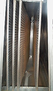 Chester-Jensen Co Falling Film Plate Chiller. Model: BG-4-0T-4-36-60. Cooling capacity: 80 tons at 128 gpm for a 26˚F suction with a 15˚ TD. (4) plates with 36 corrugations each. Plate dimensions: 5 ft. L x 3 ft. 9 in. H. Total cooling section area: 171 sq. ft. Reservoir Tank- 130 Gallon, inside straight-wall dimensions: 5 ft. 5 in. L x 2 ft. 4 in. W x 1 ft. 5 in. H. Inlets: (1) 1-1/2 in. dia. liquid feed port, (1) 3 in. dia. refrigerant feed port. Outlets: (1) 2 in. dia. NPT (overflow), (1) 2 in. dia. NPT (discharge), (1) 3 in. dia. refrigerant suction port. Overall dimensions: 7 ft. 4 in. L x 2 ft. 8 in. W x 7 ft. 7 in. H. (BG)