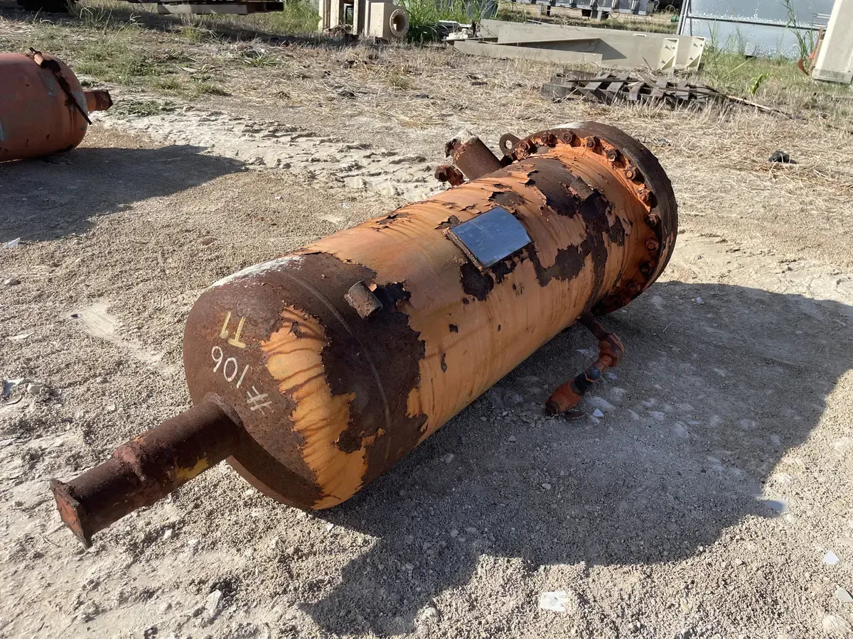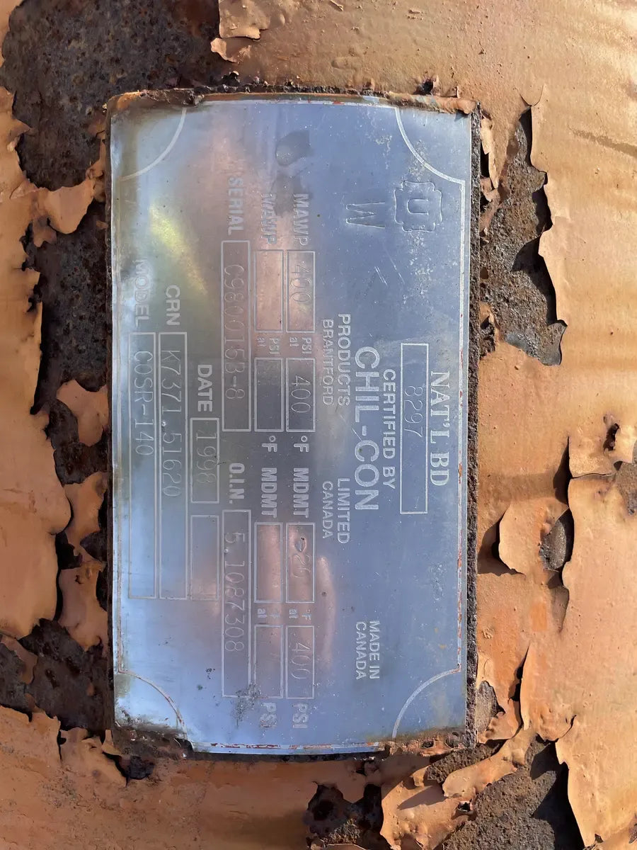 Chi-Con COSR-140 Horizontal Oil Separator (16in x 38-1/8in. 42 Gallons) Serial Number: C980015B-8. Tank National Board Number: 8297. Tank Estimated Capacity (Gallons): 42. Tank MAWP (PSI @ Temp): 400 PSI @ 400 F. Tank MAWT (PSI @ Temp): -20 @ 400 PSI. The previous refrigerant was Ammonia (R717 | NH3). Manufactured in 1998. Shipping Dimensions (Inches): 52 x 20 x 20. 750 LB