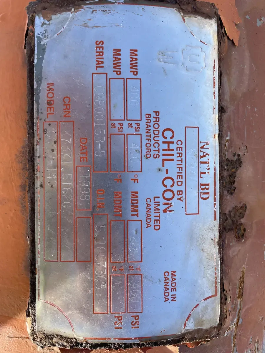 Chil-Con COSR-140 Horizontal Oil Separator (16in x 38-1/8in. 42 Gallons) Serial Number: C980015B-5. Tank National Board Number: 8294. Tank Estimated Capacity (Gallons): 42. Tank MAWP (PSI @ Temp): 400 PSI @ 400 F. Tank MAWT (PSI @ Temp): -20 F @ 400 PSI. The previous refrigerant was Ammonia (R717 | NH3). Manufactured in 1998. Shipping Dimensions (Inches): 52 x 20 x 20. 750 LB