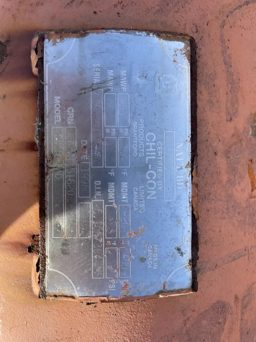 Chil-Con COSR-140 Horizontal Oil Separator (16in x 38-5/8in.42 Gallons) Serial Number: C980015B-4. Tank National Board Number: 8293. Tank Estimated Capacity (Gallons): 42. Tank MAWP (PSI @ Temp): 400 PSI @ 400 F. Tank MAWT (PSI @ Temp): -20 F @ 400 PSI. The previous refrigerant was Ammonia (R717 | NH3). Manufactured in 1998. Shipping Dimensions (Inches): 54 x 17 x 7. 750 LB