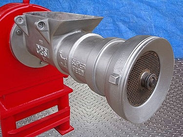 Cincinnati Butchers Supply Company Meat Grinder. Model: 569. S/N: AT 2040. Infeed hopper: 17-1/2 in. L x 9 in. W. Screw auger: 6 in. dia. x 30 in. L. Housing diameter: 7 in. dia. General Electric Motor: 10 hp, 1160/960 rpm, 440 V, 13.8/15.3 amps, 60/50 Hz, 3 phase. Inlets: (1) 13 in. L x 7 in. W infeed. Overall dimensions: 83 in. L x 23 in. W x 44-1/2 in. H.