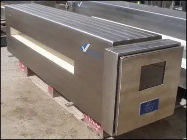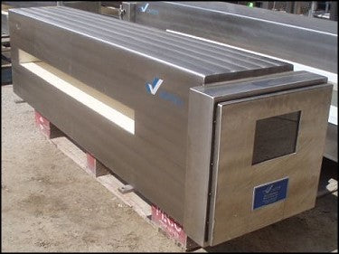 Cintex Metal Detector. Model: Auto2. S/N: 8855. Maximum Aperture/clearance: 44 in. L x 3 in. W. Actual numbers may vary depending on local site conditions, product tested, and other factors. Currently non-operational. Overall dimensions: 5 ft. 6 in. L x 1 ft. 4 in. W x 1 ft. 10 in. H.(H16).