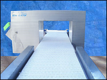 Cintex Metal Detector. Aperture/clearance: 1 ft. 1-3/4 in. W x 9 in. H. Conveyor belt dimensions: 1 ft. 2 in. W x 7 ft. 2 in. L. Infeed/exit height: 43 in. Sensitivity tested with test strips to 1.5 mm ferrous metals, 1.5 mm non-ferrous metals, and 2.0 mm non-magnetic stainless steel. Actual numbers may vary depending on local site conditions, product tested, and other factors. Overall dimensions: 7 ft. 3-1/2 in. L x 3 ft. W x 4 ft. 9 in. H.