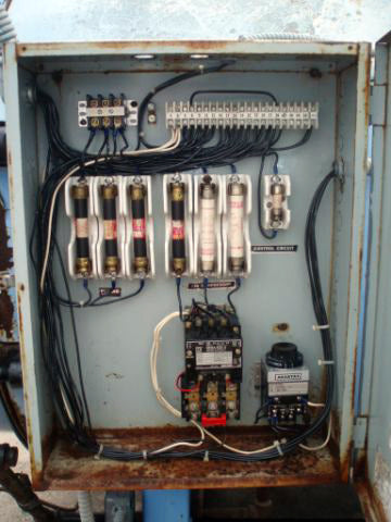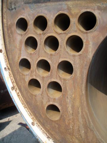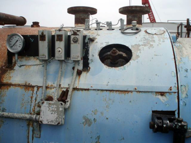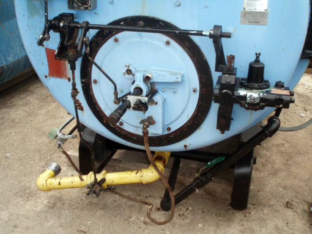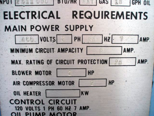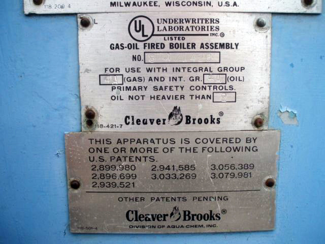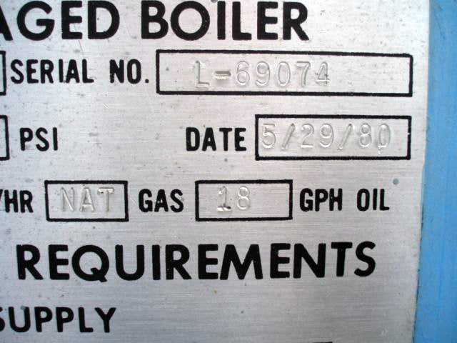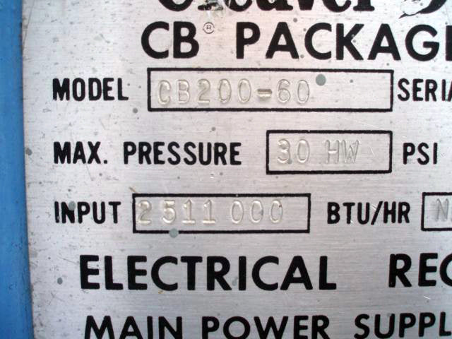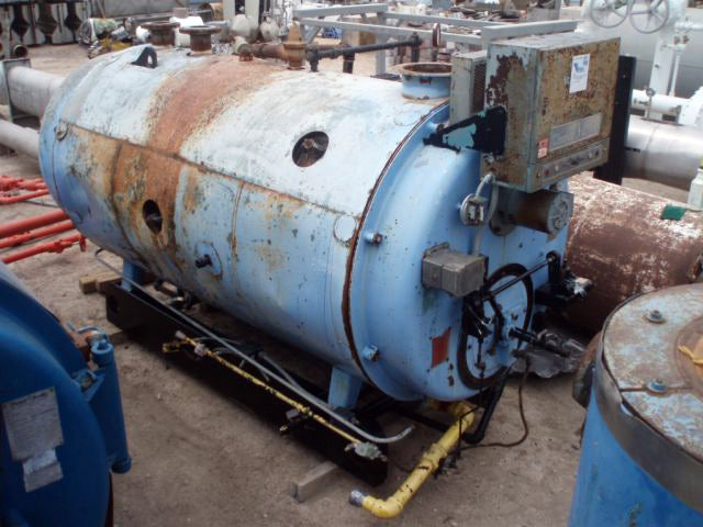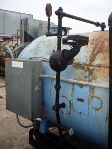 Cleaver Brooks CB-Packaged Firetube Boiler- 60 HP. Model: CB200-60. S/N: L-69074. Input: 2,511,000 BTU/HR. Maximum pressure: 30HW psi. Fuel: Gas-Oil. Burner: 4A natural gas. Oil type: 4A. Oil supply: 0.3 gpm (18 gph). Power supply: 460 V, 7 amps, 60 Hz, 3 phase. Minimum circuit ampacity: 8 amps. Maximum circuit protection 28 amps. Cleaver Brooks Motor, 2 and 1-1/2 hp, 3510/2850 rpm, 200-230/460-190/380 V, 5.8-5.4/2.7-5.0/2.5 amps, 60/50 Hz, 3 phase. A Firetube boiler is a cylindrical vessel, with the flame in the furnace and the combustion gases inside the tubes. The furnace and tubes are within a larger vessel containing the water which is converted to steam or hot water for process applications or hydronic comfort heating. Hot water is commonly used in heating applications with the boiler supplying water to the system at 180 °F to 220 °F. The operating pressure for hot water heating systems usually is 30 psig to 125 psig. Inlets: (2) 5 in. dia. flanged ports. Outlets: (1) 10 in. dia. flanged port, (1) 2 in. dia. NPT fitting (relief valve), (1) 1 in. dia. low water cut off port, (1) 2 in. dia. drain port. Overall dimensions: 10 ft. 10 in. L x 6 ft. 11 in. W x 6 ft. 9 in. H.(H15).
