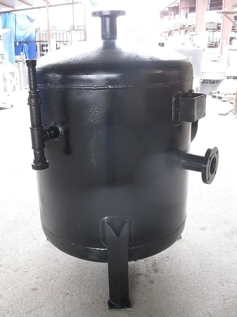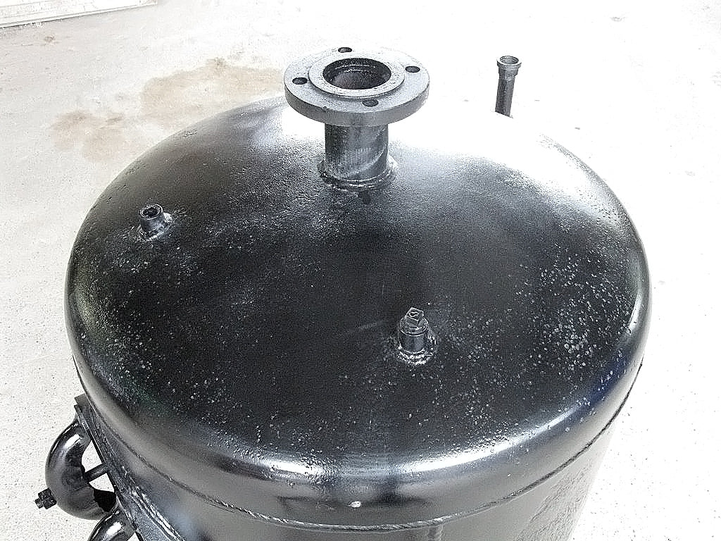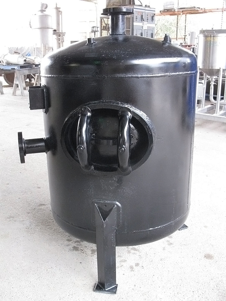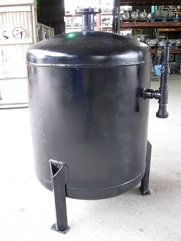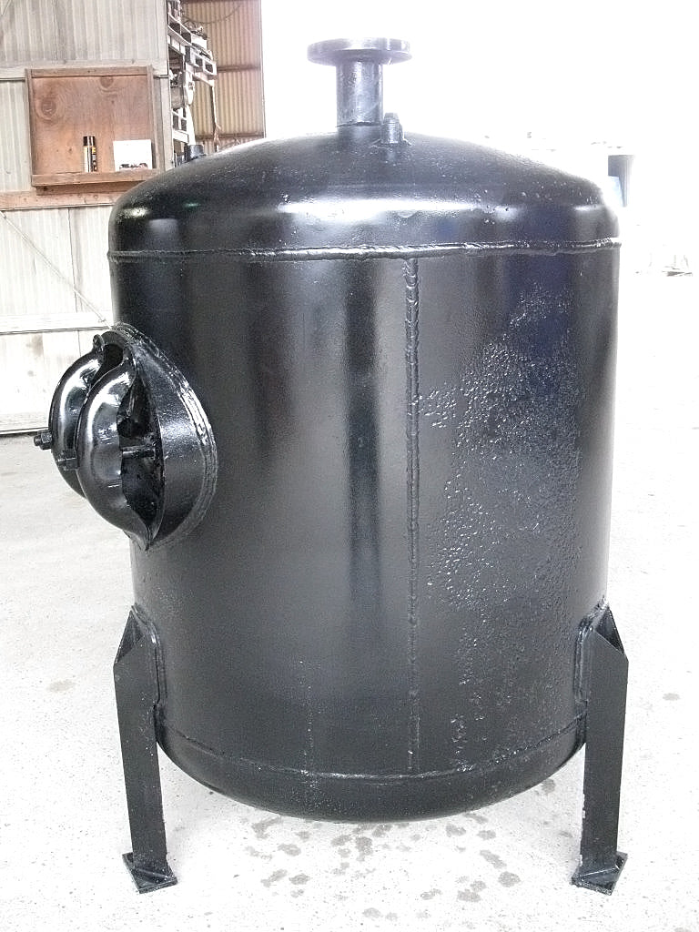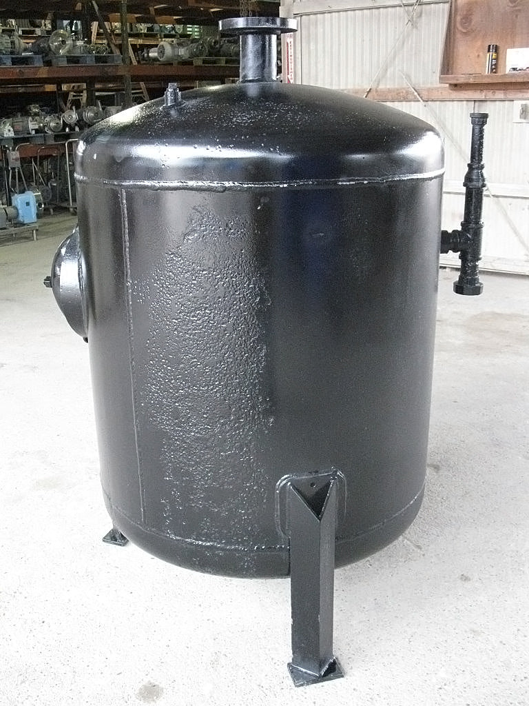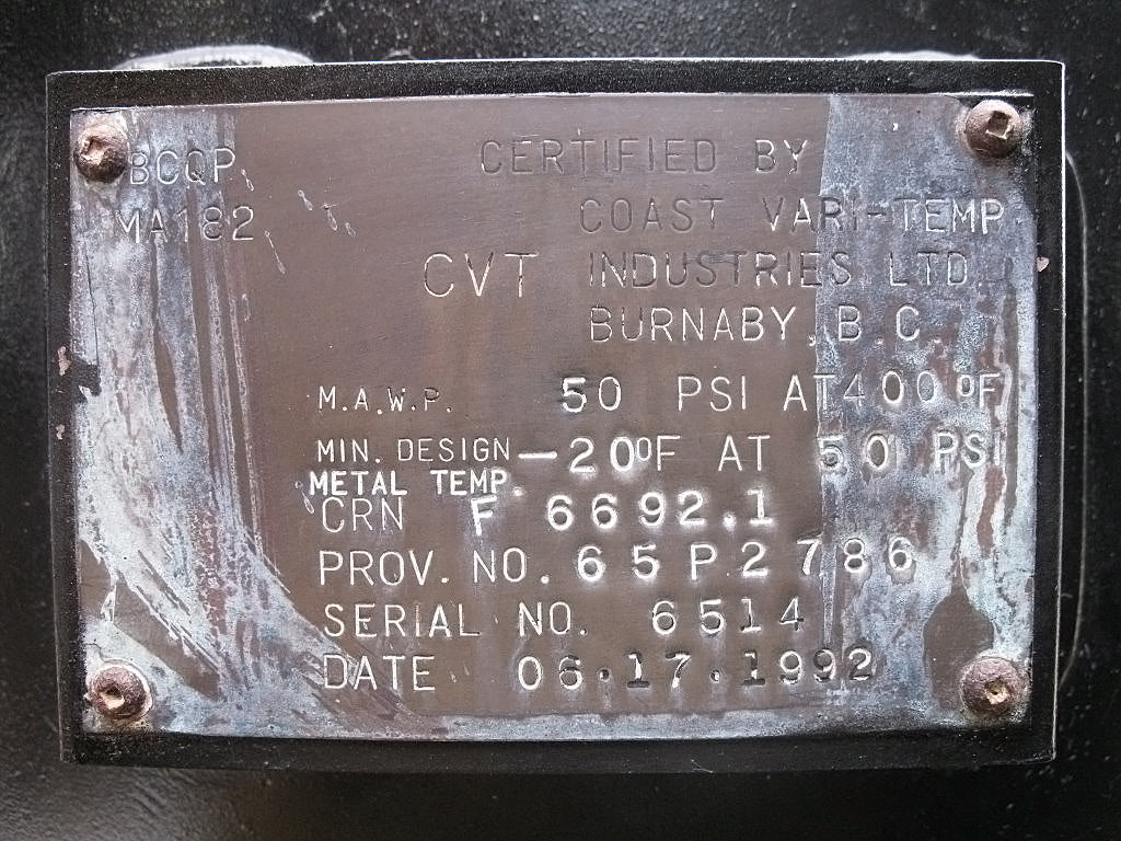 Coast Vari-Temp (CVT) Industries Holding Tank. S/N: 6514. M.A.W.P: 50 PSI at 400 ° F. Min. Design Metal Temp: -20 °F at 50 psi. CRN: F 6692.1. Prov. No. 65P2786. Date: 06-17-1992. BCQP MA 182. Tank dimensions: 3 ft. dia. x 2 ft. 7-1/2 in. straight wall (150 gallons). Manway: 1 ft. 4 in. W x 1ft. 3/8 in. H. Inlets/outlets: (2) 3 in. flanged ports, (1) 2-1/2 in. FNPT, (1) 2 in. FNPT, (1) 1-1/2 in. MNPT, (1) 1 in. FNPT. Overall dimensions: 3 ft. 6 in. L x 3 ft. 6 in. W x 5 ft. H.