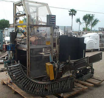 Combi America Model CPP BEII compact case erector and soft drop packer for round or non round bottles and cans S/N 1190-03 (1990) approx overall size: 11 ft. length x 7 ft. width x 8 ft. height approx speed: up to 15 cases per minute depending on pack pattern, approx case size: Length: 8-1/4 in. - 16-1/2 in., Width: 5 in. - 12-1/4 in., Height: 6 in. - 19-1/2 in., case erector: Model BE S/N 1190-02, unit erects and packs case but does not seal case, infeed: 8 ft. length x 10 in. width plastic tabletop conveyor, case: 24 in. x 40 in. length flat magazine with vacuum pickoff, discharge: powered roller conveyor, controls: complete with Omron SC20 PLC general description of operation- the product is collated from the single infeed conveyor with a pneumatic pushing unit. The desired pack pattern is collated in a packing grid assembly. When the proper pack pattern is completed, a pneum gripper assembly is lowered to the top of the product and gripped. The grid assembly opens, and the product is soft-set to the bottom of the case; set up by the case erector. When the cycle is completed, the loaded case is positively discharged. Various methods are used to place pack the product. unit currently has angular grippers but can be changed to suction cups or bellows type cups.