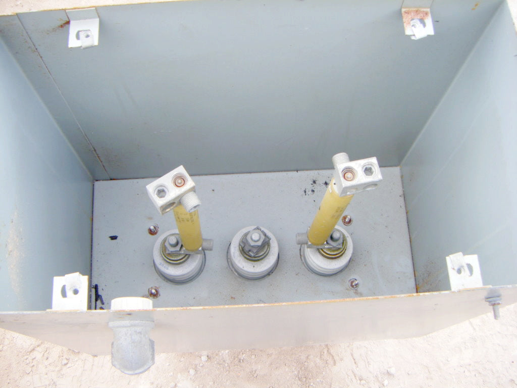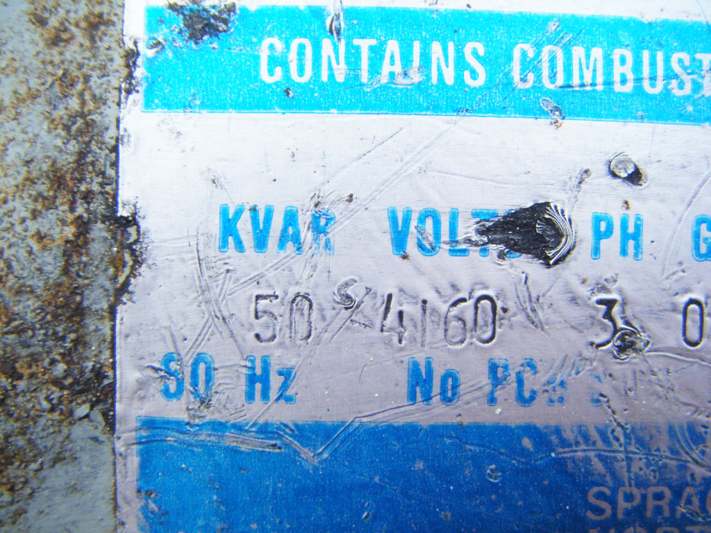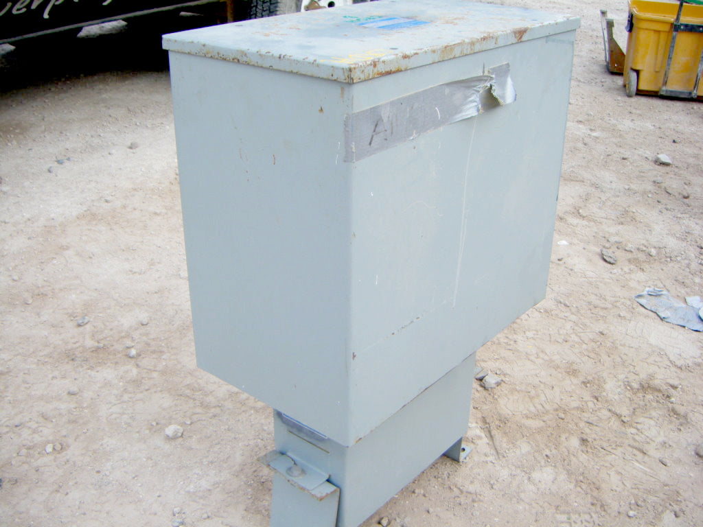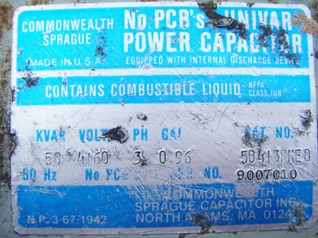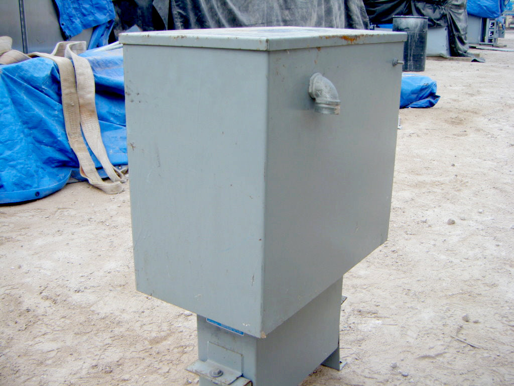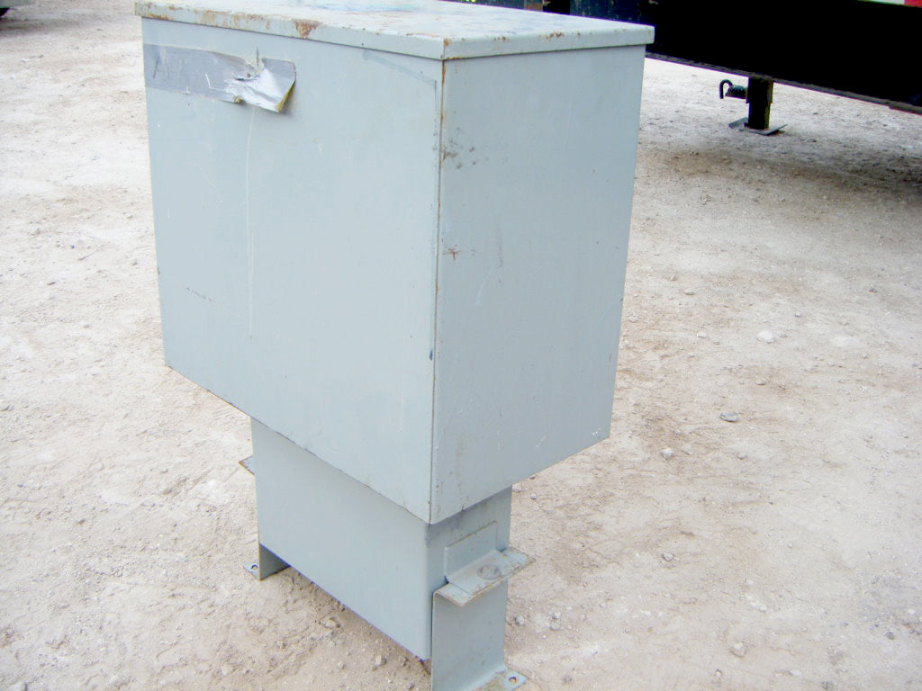 Commonwealth Sprague Capacitor. Cat No: 50413FKED. S/N: 9007010. Power requirements: 4160 V, 3 phase, 60 Hz, 50 KVAR. Overall dimensions: 1 ft. 8-1/2 in. L x 11-1/2 in. W x 2 ft. 8 in. H.