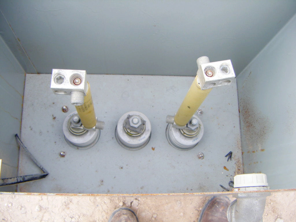 Commonwealth Sprague Capacitor: Cat no: 50413FKED. S/N: 9007009. Power requirements: 4160 V, 3 phase, 60 Hz, 50 KVAR. Overall dimensions: 1 ft. 8-1/2 in. L x 11-1/2 in. W x 2 ft. 8 in. H.