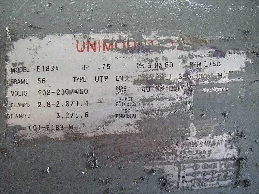Conveyor. U.S. Electrical motor: .75 hp, 1750 rpm, 208-230/460 v, 2.8-2.8/1.4 a, 60 Hz, 3 phase. U.S. Electrical motor drive: 1 max input hp, 966 max output torque. Belt dimensions: 11 ft. 6 in. L x 11-3/4 in. W. Overall dimensions: 5 ft. 11 in. L x 2 ft. W x 3 ft. 4 in. H.