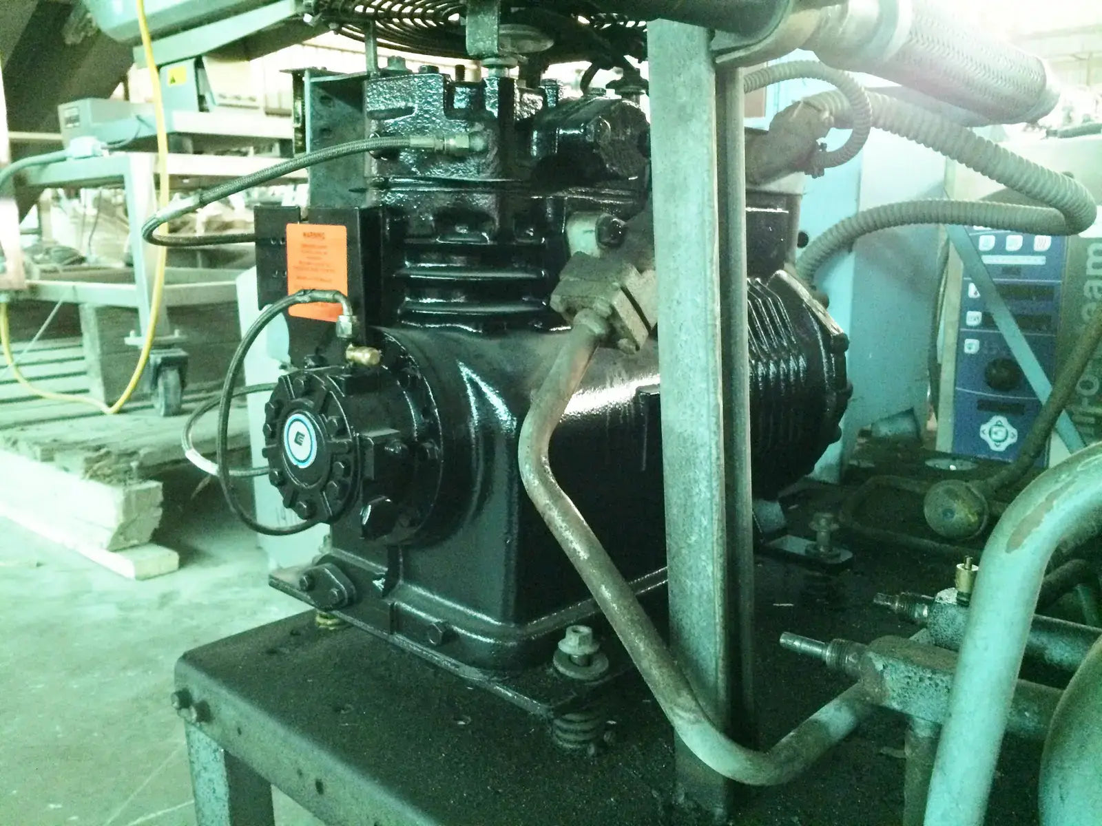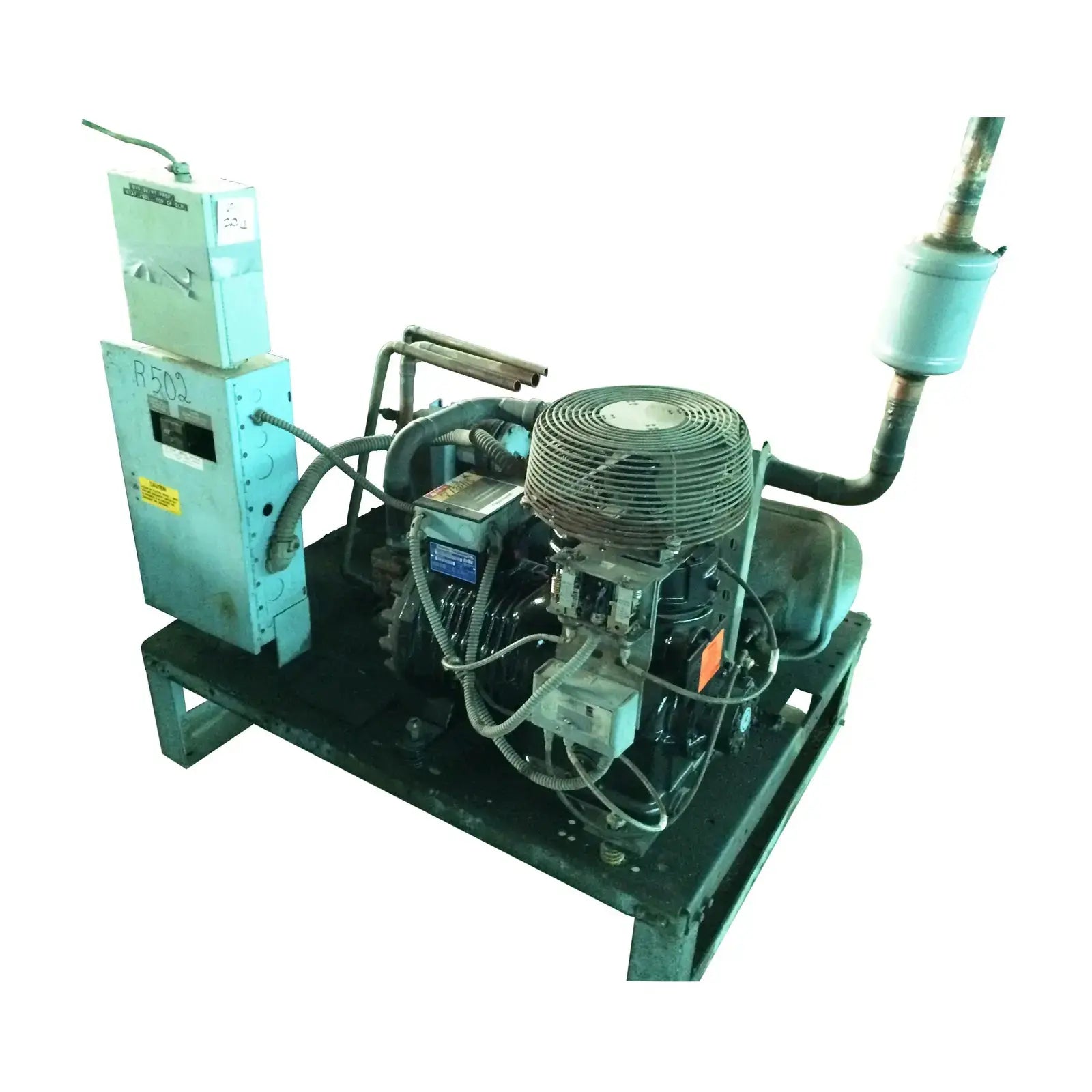 Freon Semi-Hermetic Refrigeration Compressor Skid. R-502 refrigerant. 208/230V, 3-phase, 60 Hz. Compressor was replaced with new July 2015. Copeland Copelametic 9-Series model 9RS3-076A-TFC-800, serial 14163160R, 208-230V 3-phase 60 Hz (also rated for 200-220V 50 Hz). Rated for 7.5 HP, 57,500 BTUH at +20F, 40,600 BTUH at 0F. Unit was removed February 2016 from a supermarket that shut down. (ACN40)