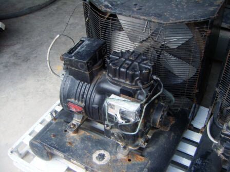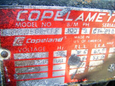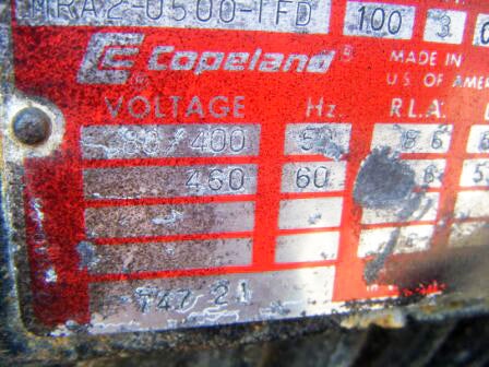 Copeland Copelametic Freon Condensing Unit. Model: MRA2-0500-TFD. S/N: CT91D04018. Fan motor: ½ HP, 1100 RPM, 460 V, single phase, 2.1 A, 50/60 Hz. Overall Dimensions: 3 ft. 2 in. L x 2 ft. 4 in. W x 2 ft. 5 in. H.(ACN22a).
