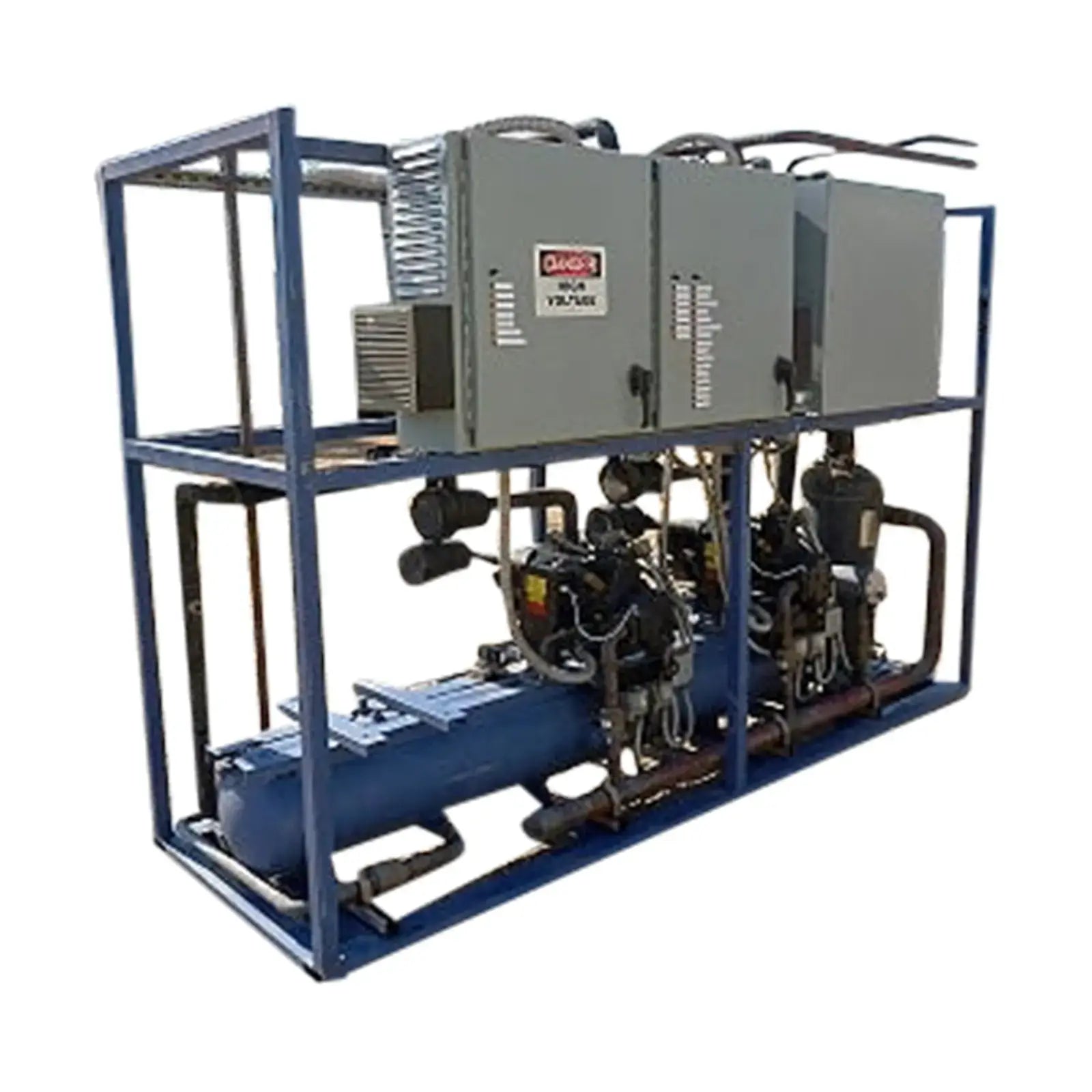 2000 Copeland Screw Low Temperature Compressor Package - 40 HP. Model: SHL2-2000-TWK-200. S/N's: 00L400018 and 00L4015. Semi-hermetic. Refrigerant: R-22. Electrical requirements: 230/460 V, 81/41 amps. Made in Germany. 2000 Standard Refrigeration Liquid Receiver Tank, Model: OA4088. 2002 Standard Refrigeration Oil Separator, Model: 5803035. 2001 Dunham-Bush Shell and Tube Oil Condenser, Model: RX65. This system was designed for a research ice making application and it was only run for one month. The rack has room to install a third compressor for additional capacity. The compressors have Hitachi SJ300 inverter drive controls (50/60 Hz, 380-480V, 3-ph, Made in Japan). Overall dimensions: 15 ft. 2 in. L x 5 ft. 3 in. W x 7 ft. 10 in. H.