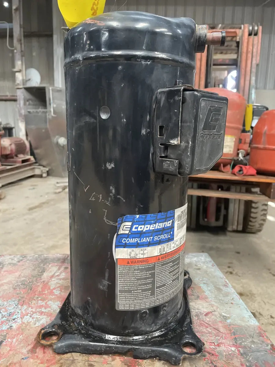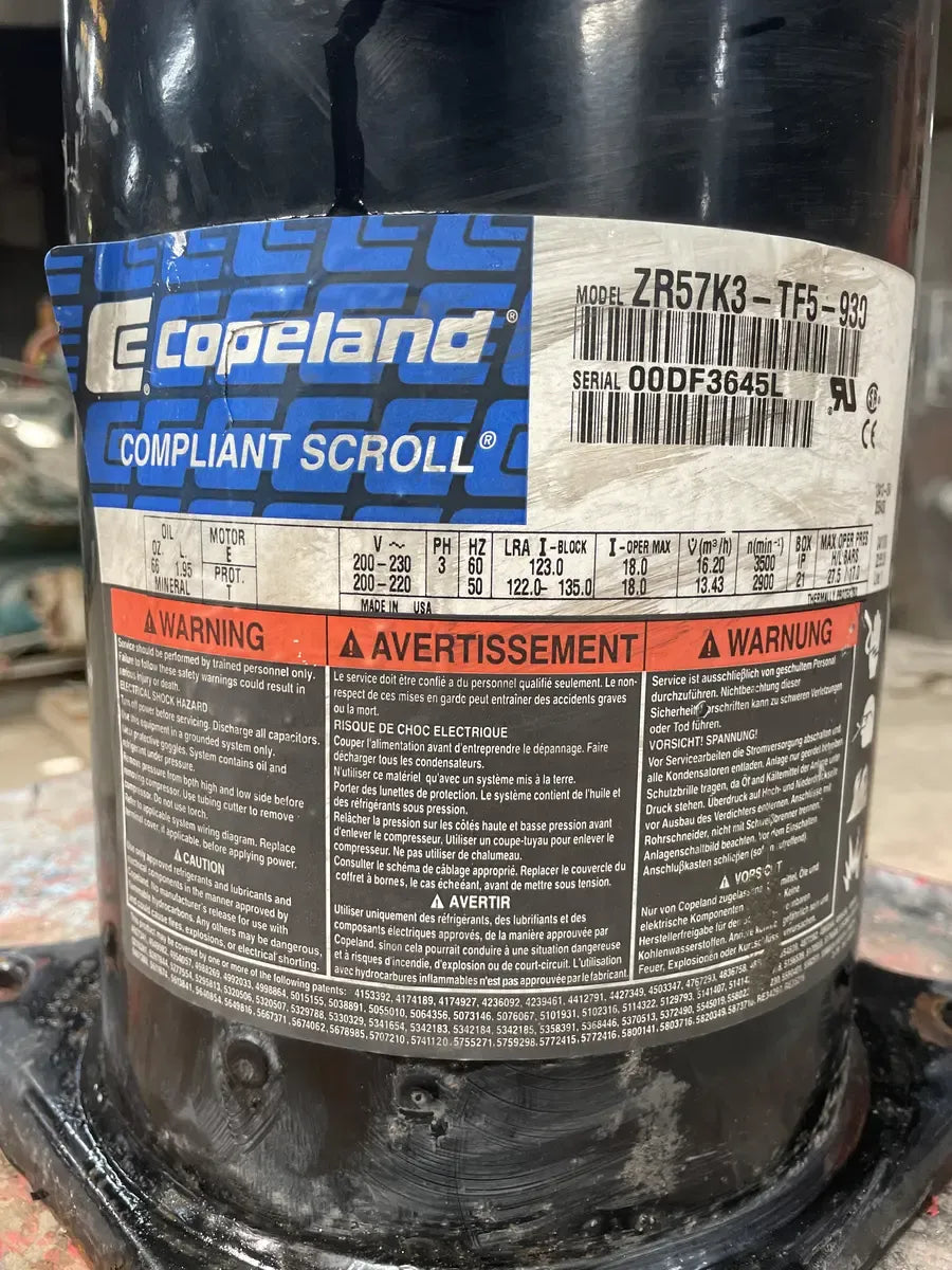 Copeland Scroll Compressor - Model: ZR57K3-TF5-930, Serial No: 00DF3645L. Volts: 200-230/ 200-220. PH: 3, Hz: 60/50, LRA I-Block: 123.0, I-Oper Max: 18.0. Max Oper Press: H/L Bars - 27.5/17.0. Oil Storage: Oz - 66, Liter: 1.95.