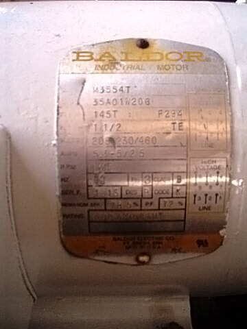 Crane Centrifugal Pump. Model: 3062 0925. S/N: DC-564970. Flow rate for new pump is 48 gpm with required horsepower and 31 TDH. Discuss with salesperson your process and product to determine if this pump should handle your specific duty. Maximum speed: 1750 rpm. Impeller diameter: 6 in. Baldor Industrial Motor, 1.5 hp, 1725 rpm, 208-230/460 V, 5.3-5.3/2.5 amps, 60 Hz, 3 phase. Inlets: (1) 1-1/2 in. dia. 125 lb. ANSI flange. Outlets: (1) 1 in. dia. 125 lb. ANSI flange. Overall dimensions: 3 ft. 4 in. L x 1 ft. 1 in. W x 1 ft. 3 in. H. (ACN35a)