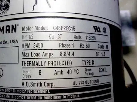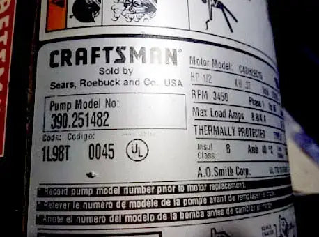 Craftsman Captive Air Water tank with Pump. Pump model: 390.251482, code: 1L98T. Motor model: C48H2EC15, ½ Hp, KW 37, 115/230 volts, 1 PH, 60 HZ, 8.8 / 4.4 amp, SF 1.3. Tank model: 390.291557, code: 1K98W. Corrosion resistant, water log free, power miser. Overall dimensions: 1 ft. 8 in. dia x 3 ft. H.