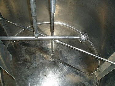 Creamery Package Jacketed Processor Tank- 1,000 Gallon. S/N 1000 9681. Stainless steel. Heat exchange jacket: 50 psig. Inlets: 3 in. top. Manway: 18 in. dia. Outlets: 2-1/2 in. treated outlet for valve, 2 in. outlet for jacket. Has an agitator. Inside dimensions: 75 in. dia. x 69 in. H. Overall dimensions: 88 in. L x 78 in. W x 93 in. H. Includes motor and motor drive.