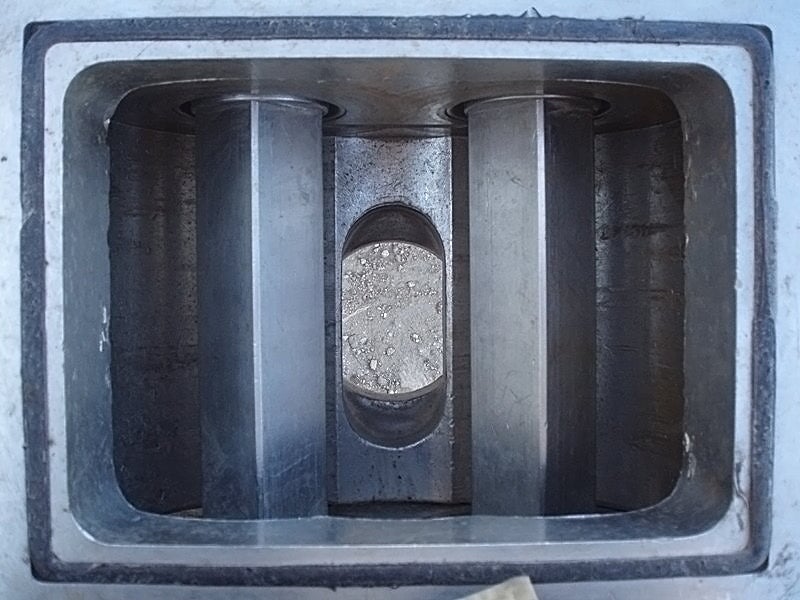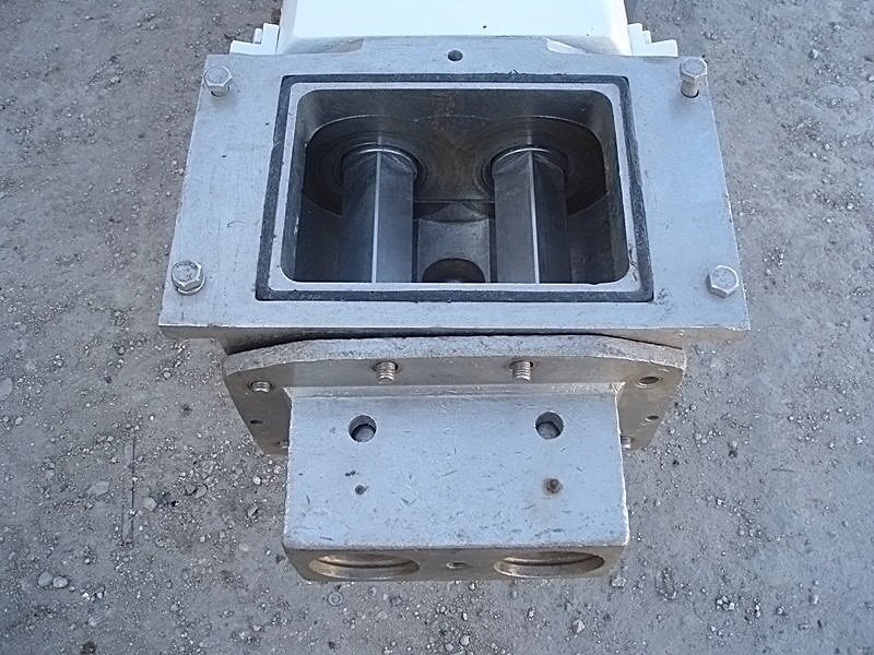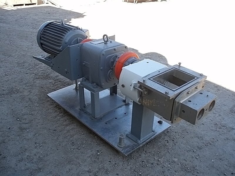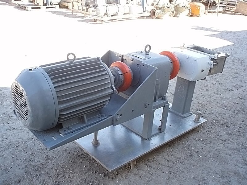 APV Crepaco Positive Displacement Pump. A.O. Smith Motor, 25 hp, 1771/1470/1765, 230/460-200/400-200 V, 62/31-72.2/36.1-68.1 amps, 60/50/60 Hz, 3 phase. Dodge TM Gear Reducer, 5.06 ratio, 350 rpm (final). Inlets: (1) 9 in. L x 6-1/2 in. W infeed. Outlets: (1) 4 in. dia. ACME fitting. Pump missing nameplate, rotors, seals, wing nuts. Overall dimensions: 6 ft. 4 in. L x 1 ft. 10 in. W x 2 ft. 8 in. H.