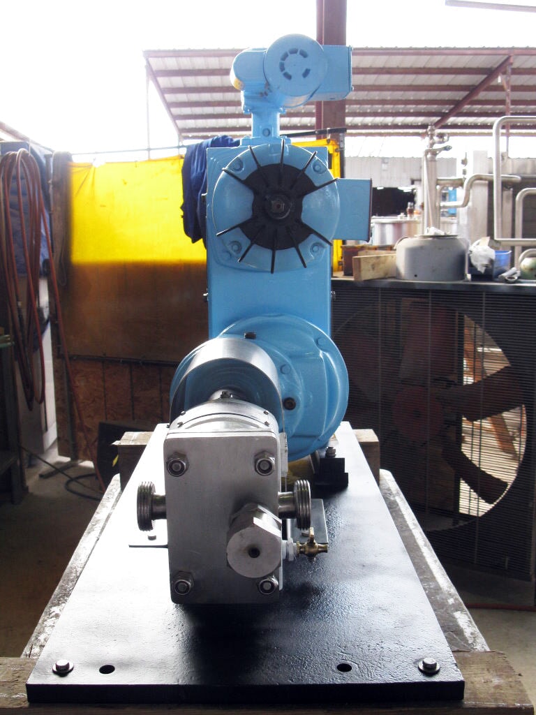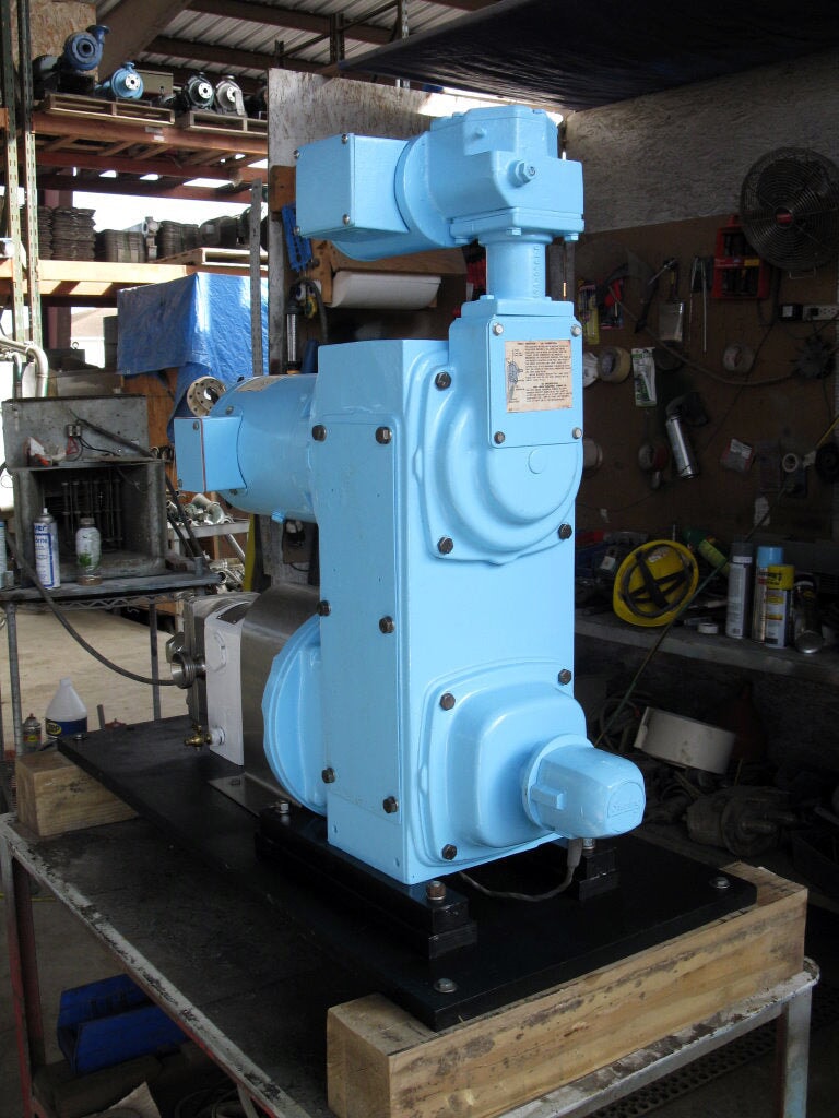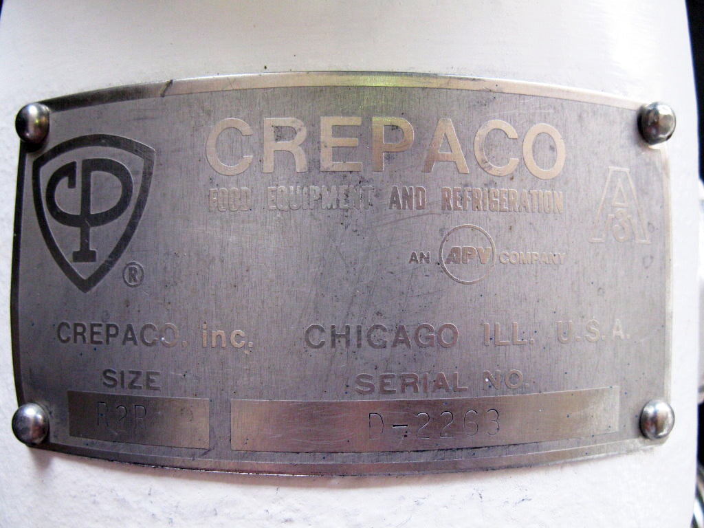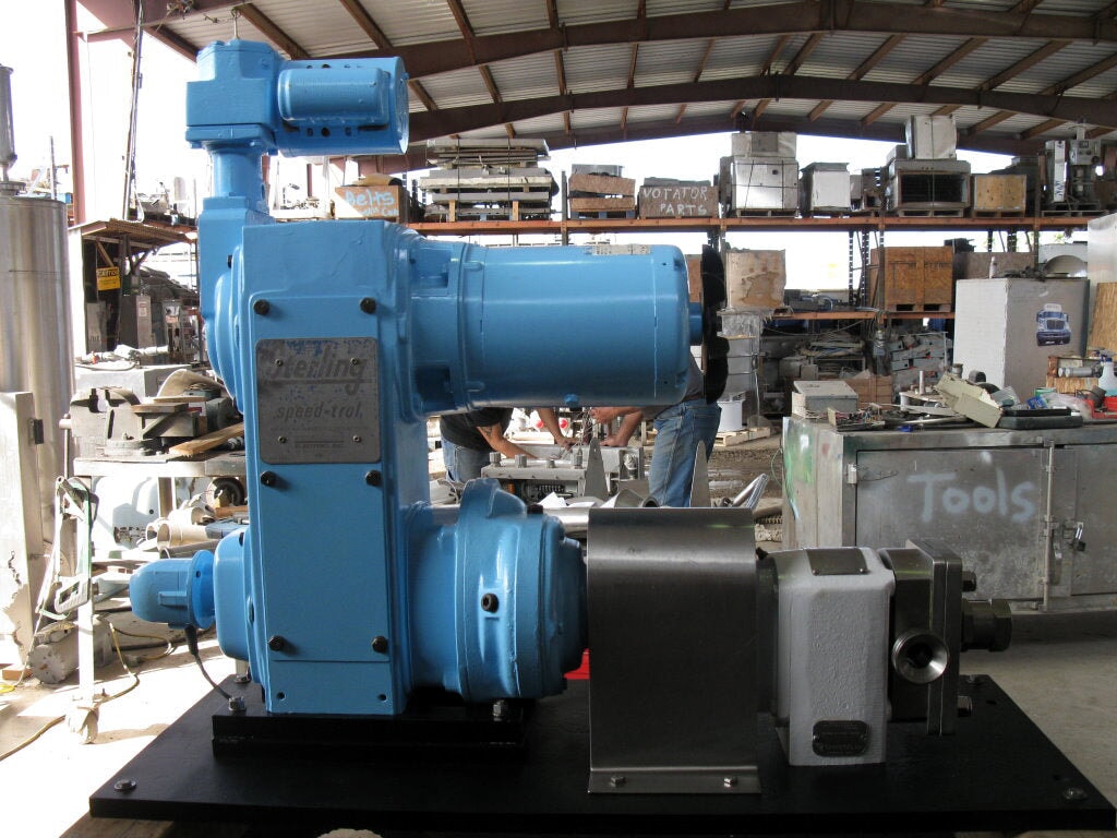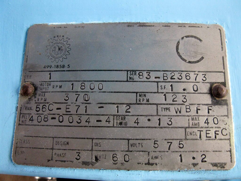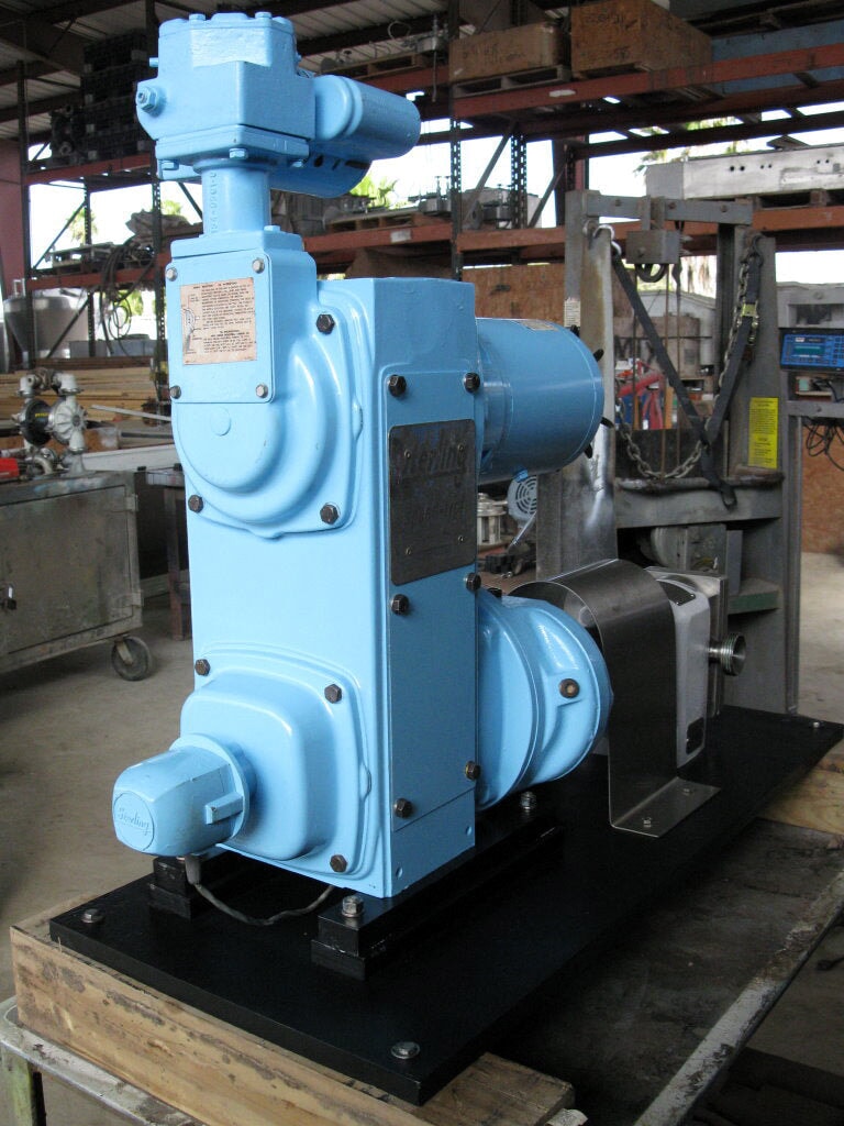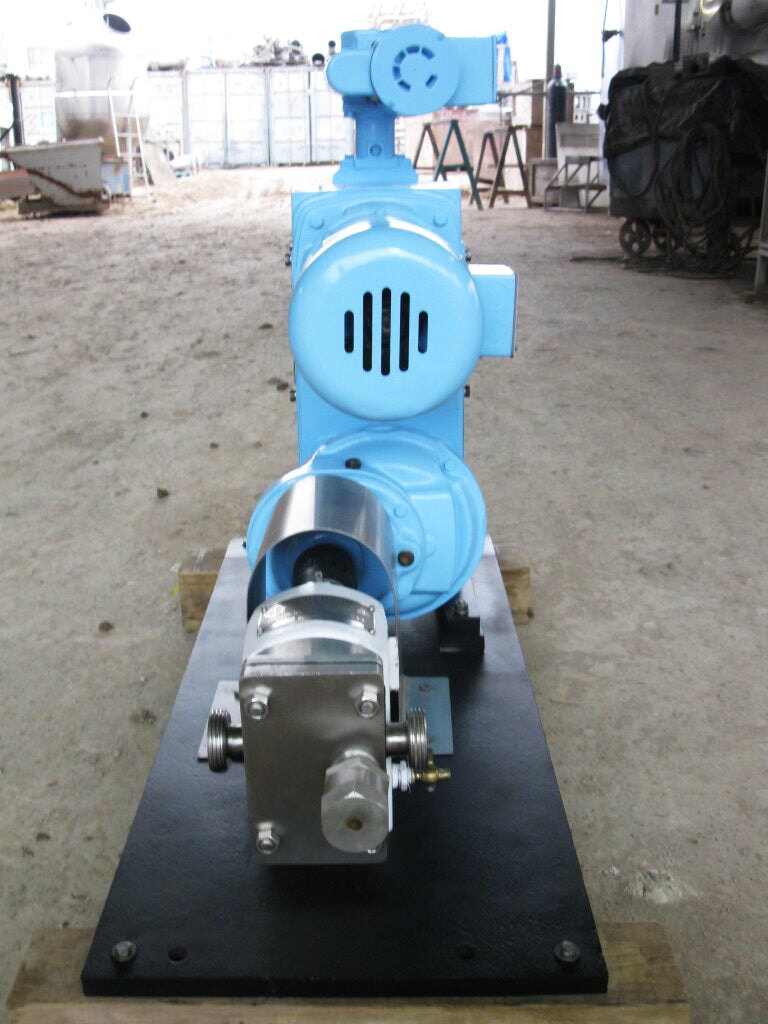 Crepaco Positive Displacement Pump. Model: R2R. S/N: D-2263. Flow rate for new pump is 6 gpm with required horsepower and pressure. Discuss with salesperson your process and product to determine if this pump should handle your specific duty.(2) 3 in. rotors. Marathon Electric motor. Motor drive: 1 Hp, 1800 rpm motor input, output rpm: 370 max, 123 min, 575 V, 1.2 A, 60 Hz, 3 Phase, 4.13 Gear ratio. Inlet/outlet: (2) 1-1/2 in. Acme ports. Overall dimensions: 3 ft. 1/2 in. L x 1 ft. 3 in. W x 2 ft. 4-1/4 in. H.