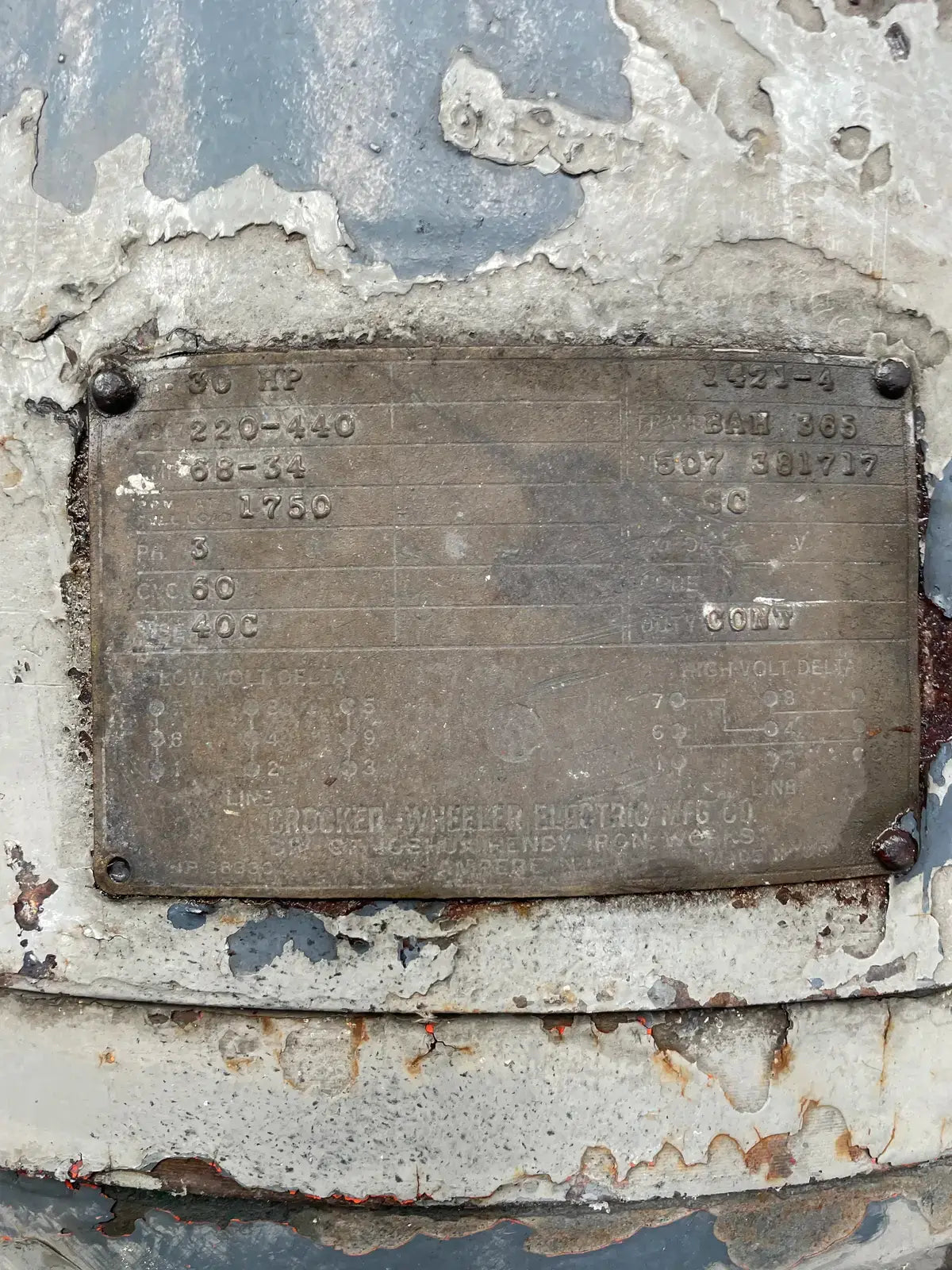 Crocker Wheeler Electric Motor. Power Supply: HP: 30, Volts: 220-440, RPM: 1750, Amps: 68-34, Ph: 3, Hz: 60, Frame: BAH 365, Duty: Cont.