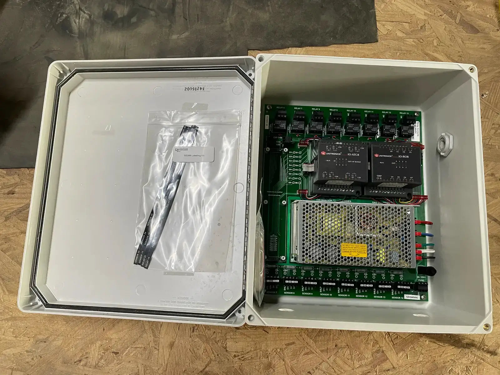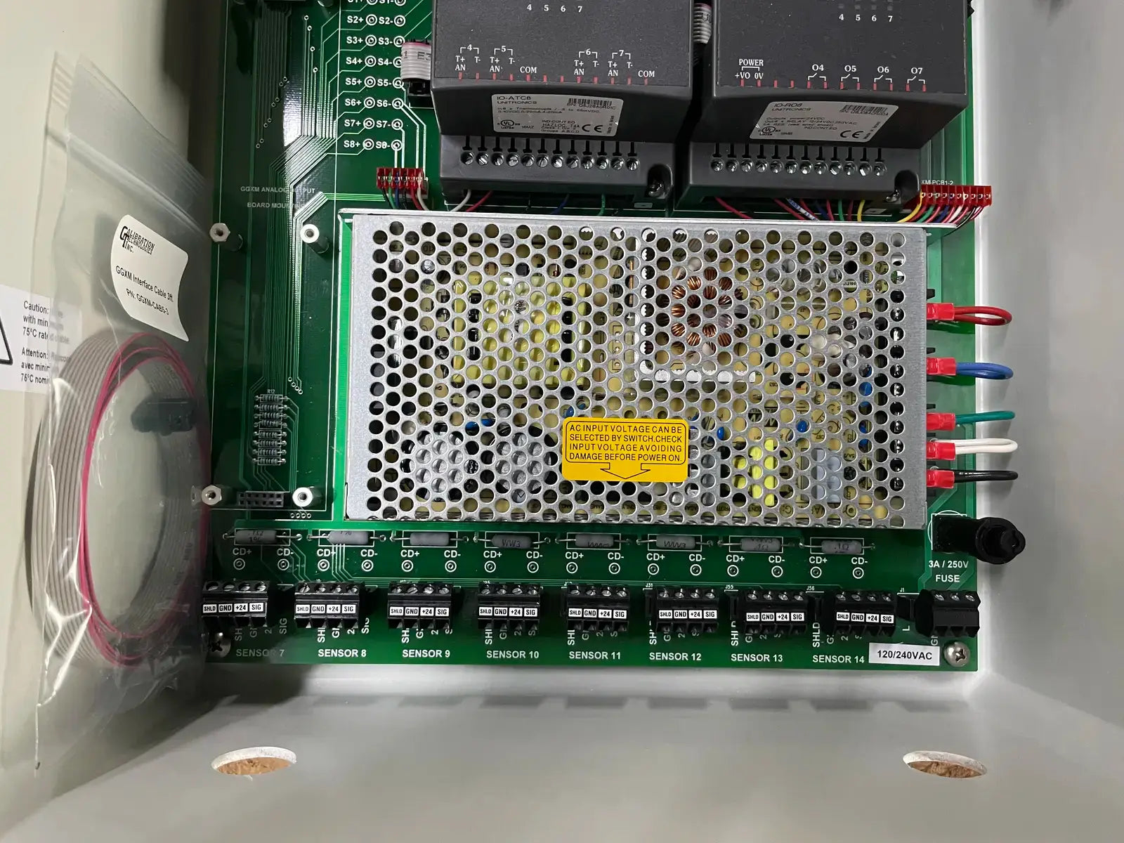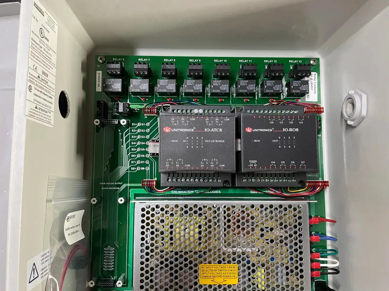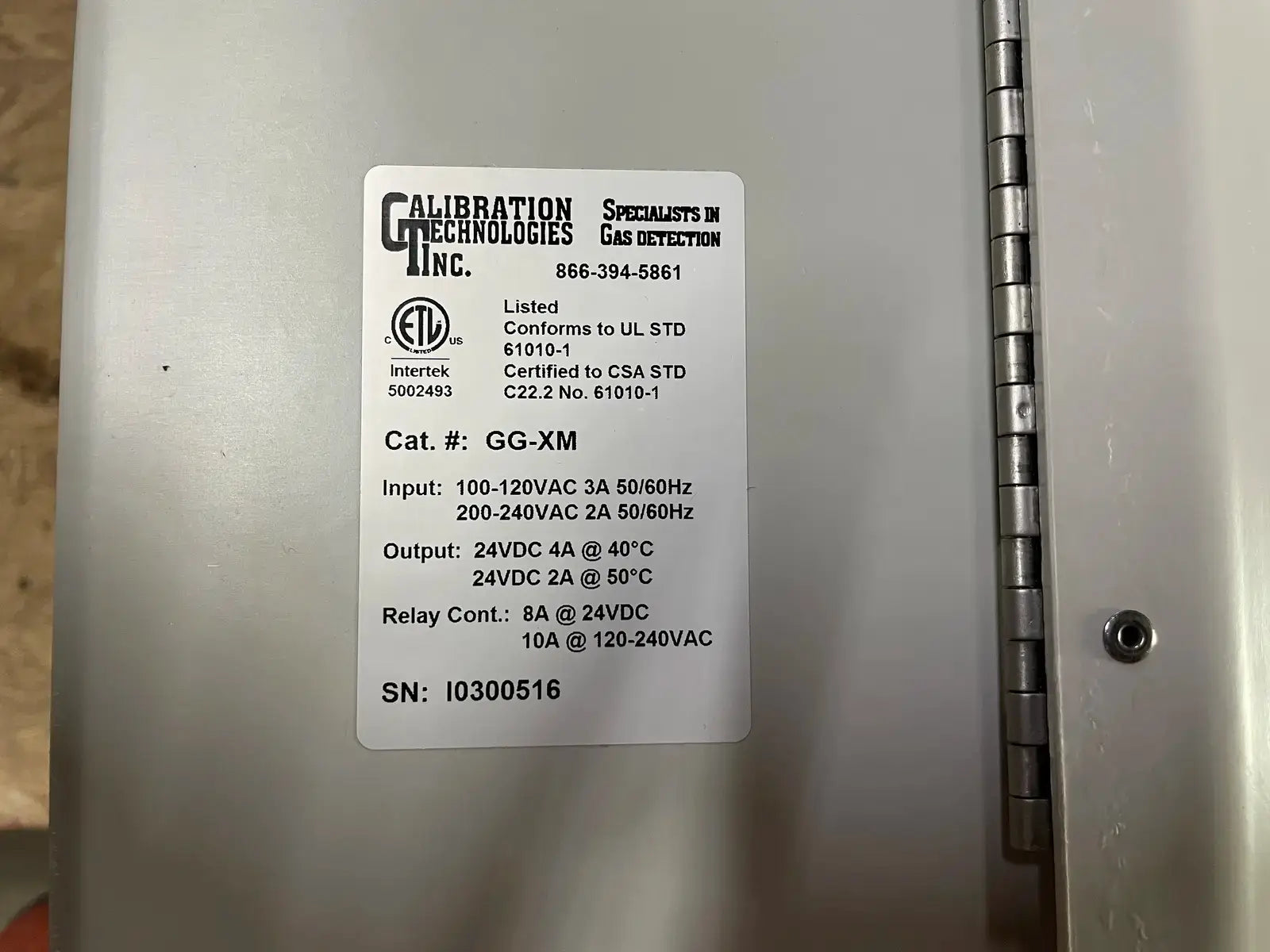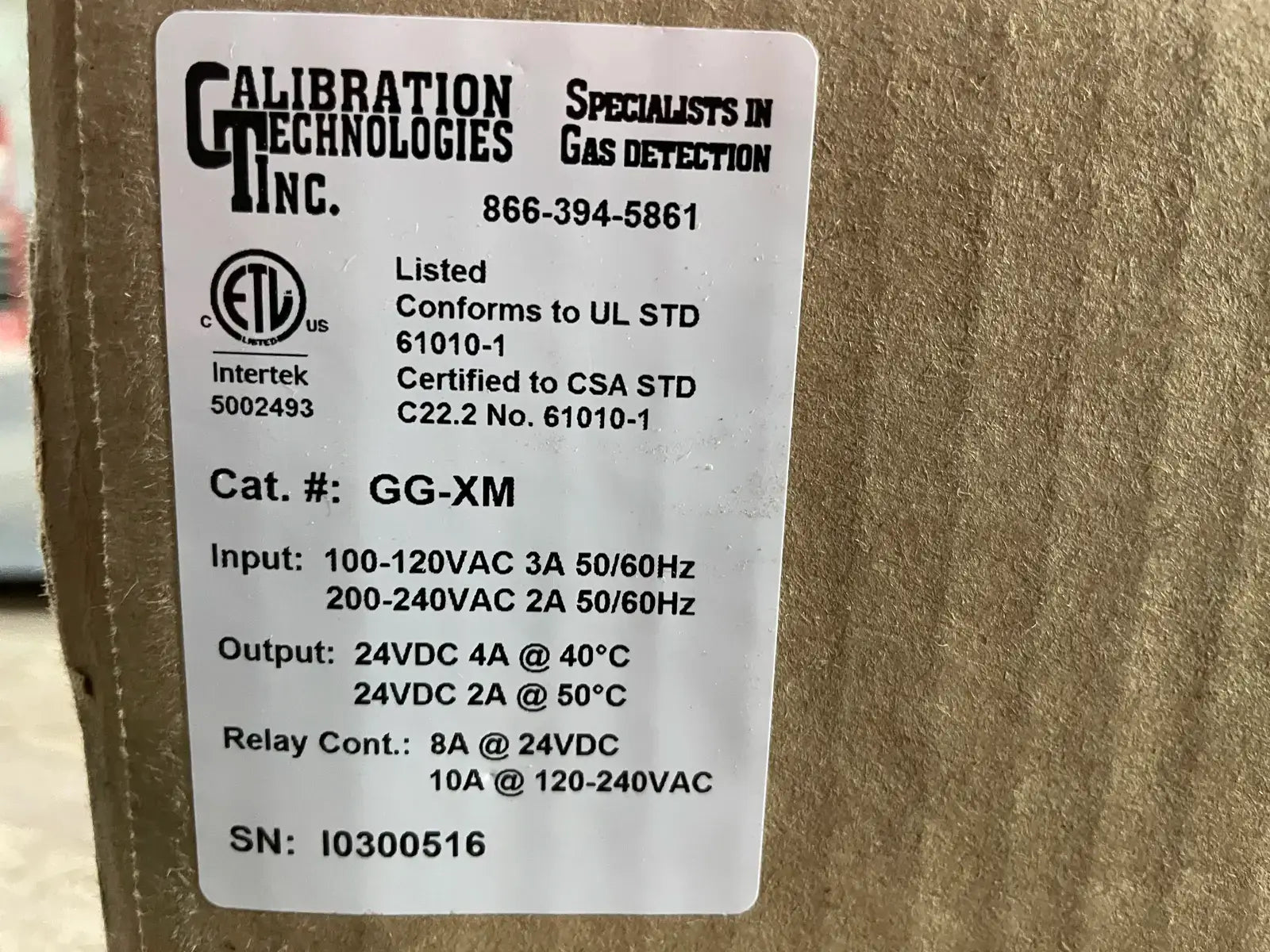 Calibration Technologies Inc Gas Guardian GG-XM 8-Channel Expansion Module. Cat. No.: GG-XM. Input: 100-120VAC/200-240VAC. 3A/2A. 50/60Hz. Output: 24VDC 4A/2A @ 50*C/40*C. Relay Cont.: 8A/10A @ 24VDC/120-240VAC. Serial No. I0300516.