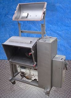 Custom MetalCraft Single Ribbon Blender with Vacuum Option. Model: SRB. Approximate capacity: 150 lbs. Materials of construction are 304 stainless steel except for drive components. Unit has 90° tilt capability. This blender can be used in vacuum or non-vacuum applications as an air-tight seal is created by shutting the unit’s gasketed door and closing off top fittings. A vacuum gauge option (3 cu. ft.) is provided for such applications. (6) 9 in. L x 2 in. W paddles. Lincoln electric motor: 3 hp, Dana hydrostatic speed variator, Model: 1114-00. Inlets: (1) 1-1/2 in. dia. NPT (product). Outlets: (1) 3/8 in. FNPT (discharge). Overall dimensions: 4 ft. 4-1/2 in. L x 2 ft. 3 in. W x 5 ft. H.(ACN285-83). (GI).