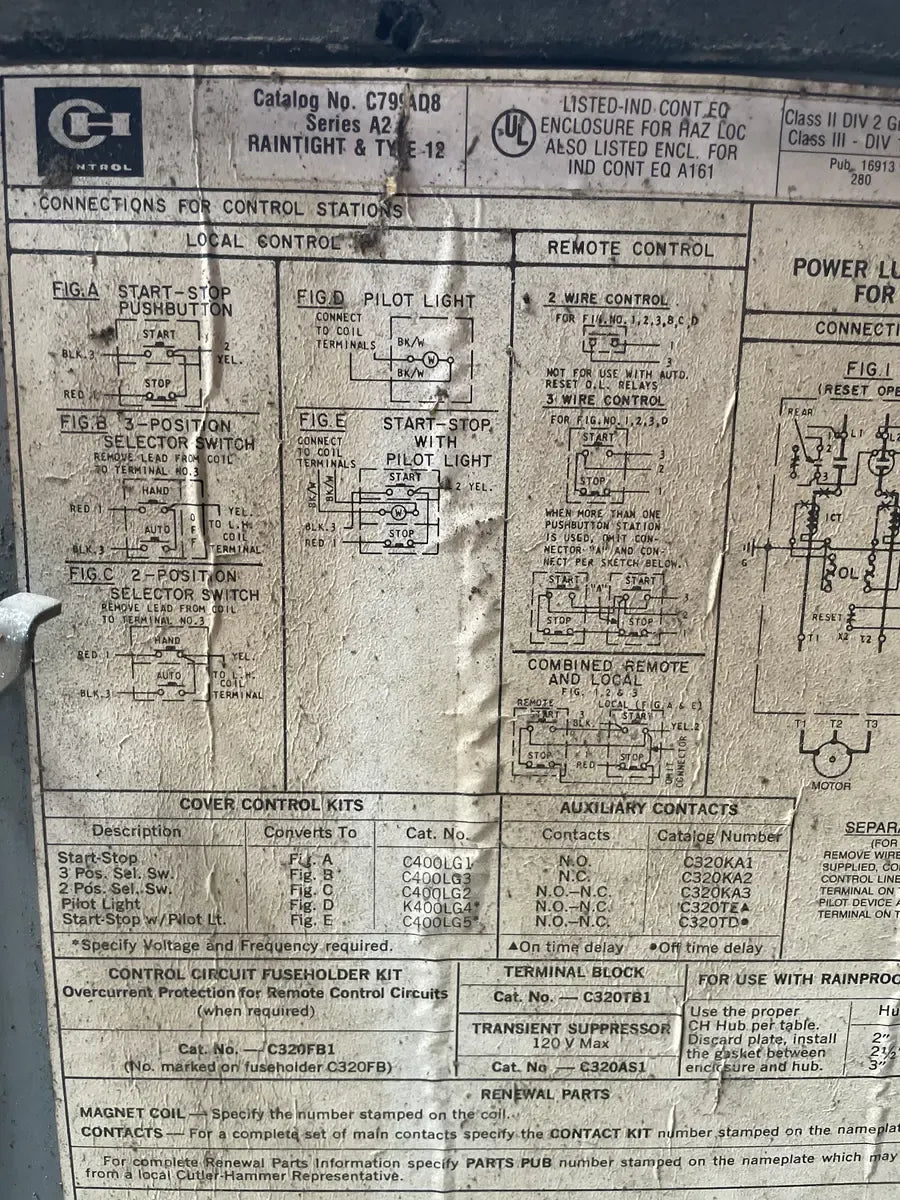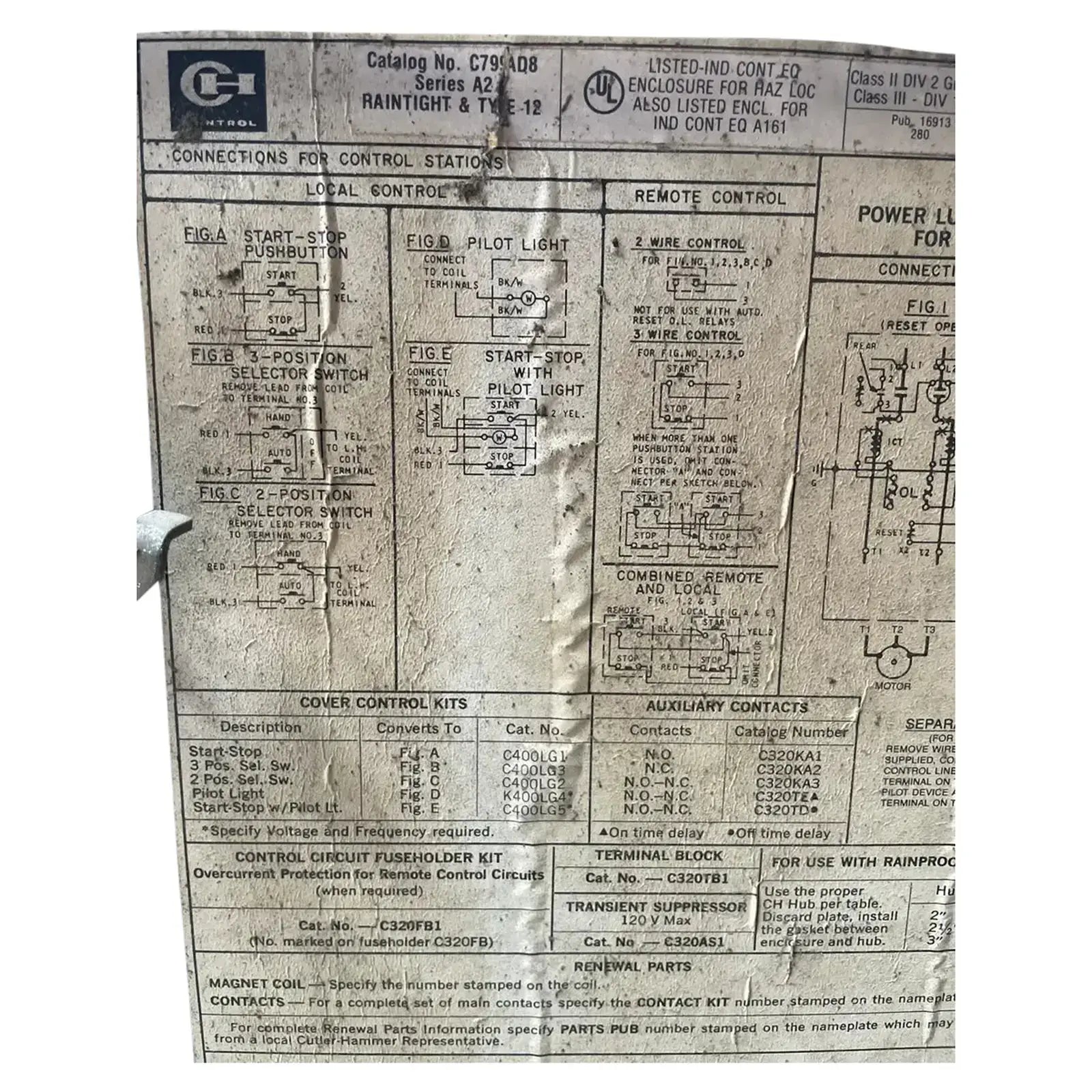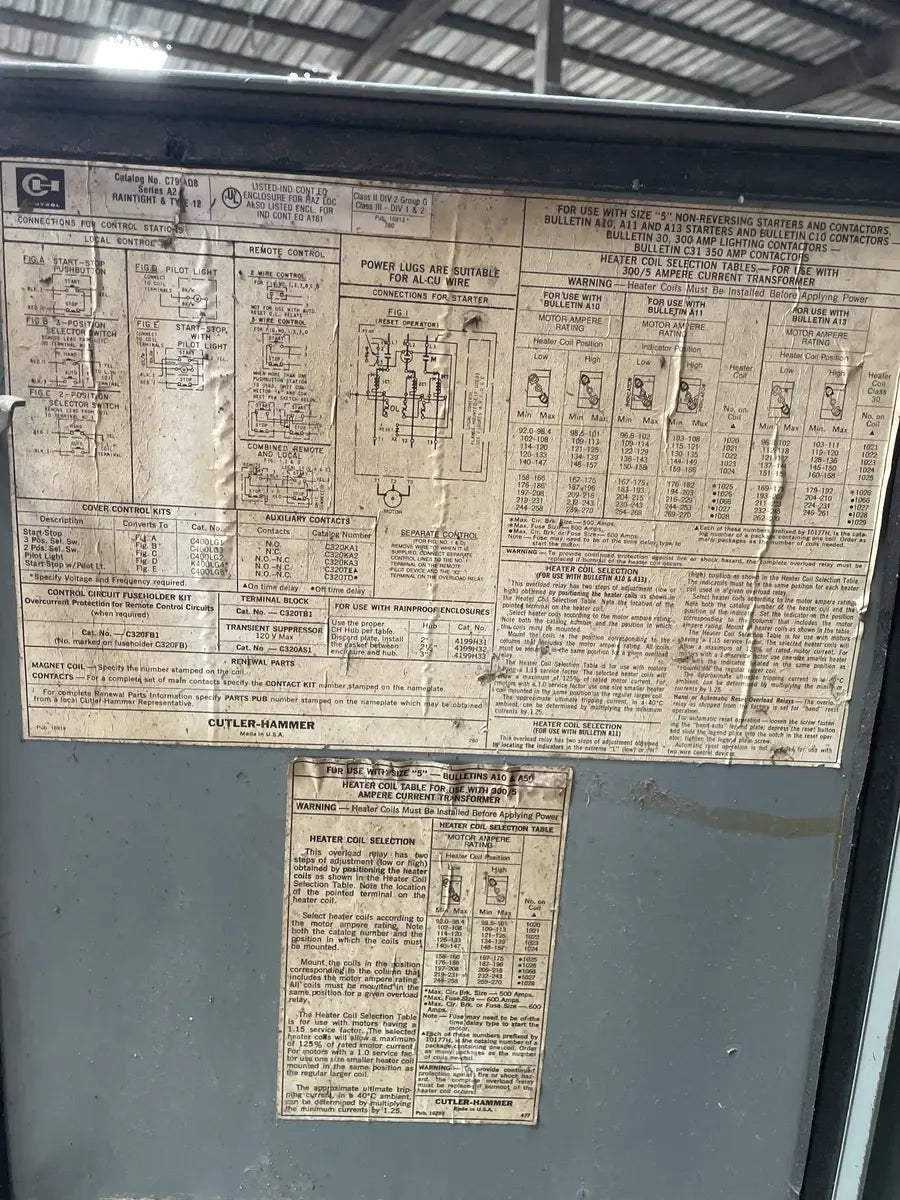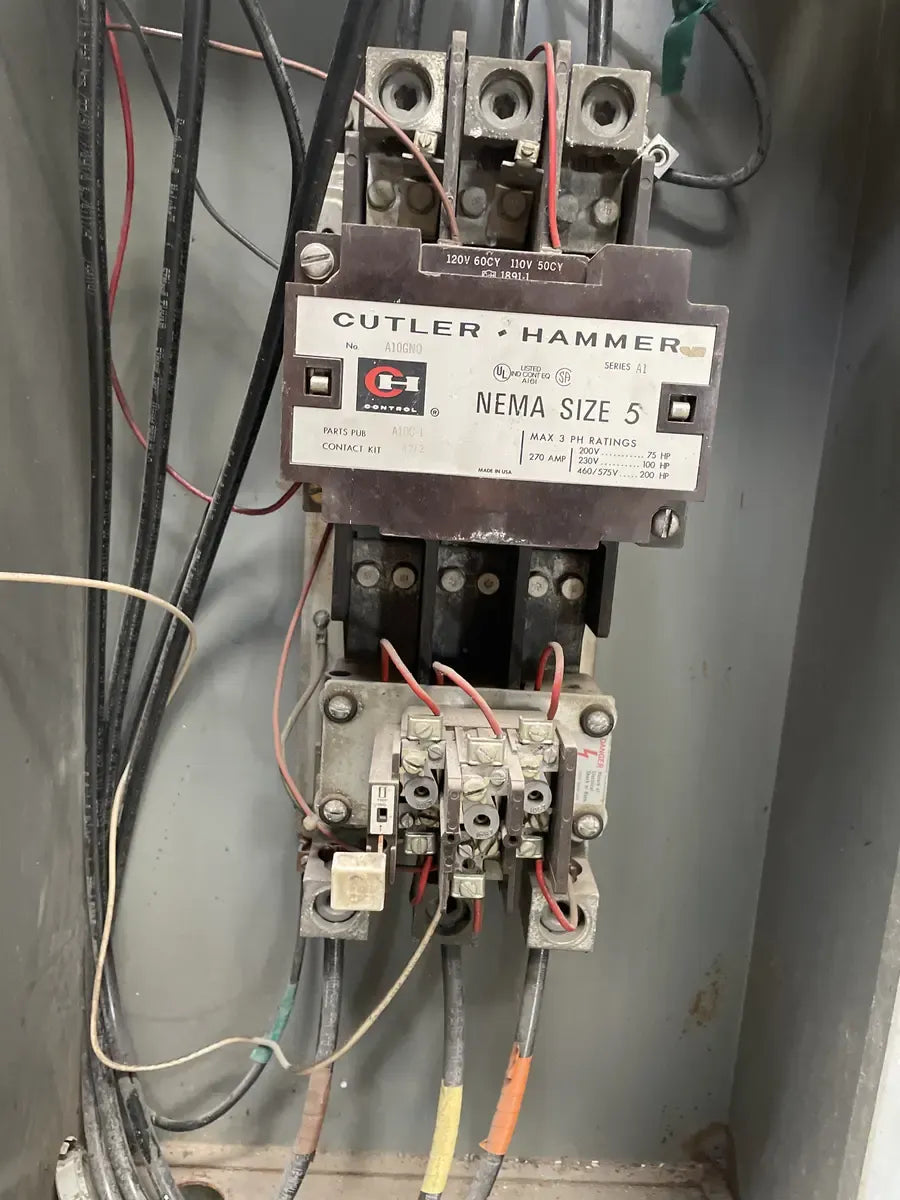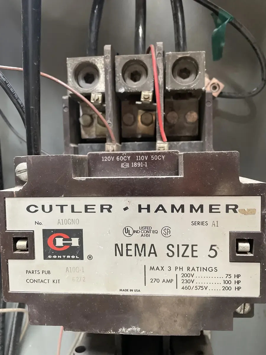 Cutler-Hammer NEMA Size 5 Motor Starter. Catalog No: A10GN0. Nema Size: 5. A1 Series. 3 Phase, 270 AMPS, 600 Volts. 110V-120V AC Coil. Max 200 HP @ 460/575 Volts. 100 HP @ 230 Volts. 75 HP @ 200 Volts. Parts PUB: A10G-1. Previous paired with a Reciprocating Compressor Motor.