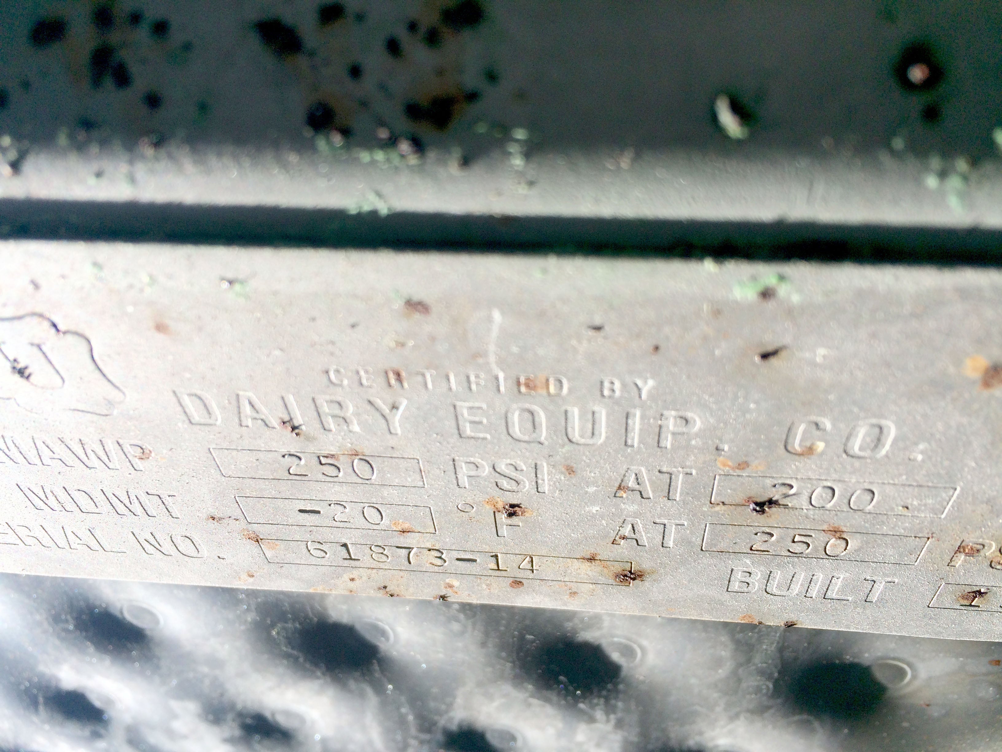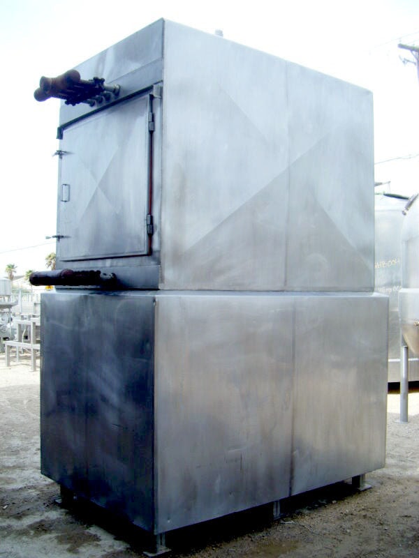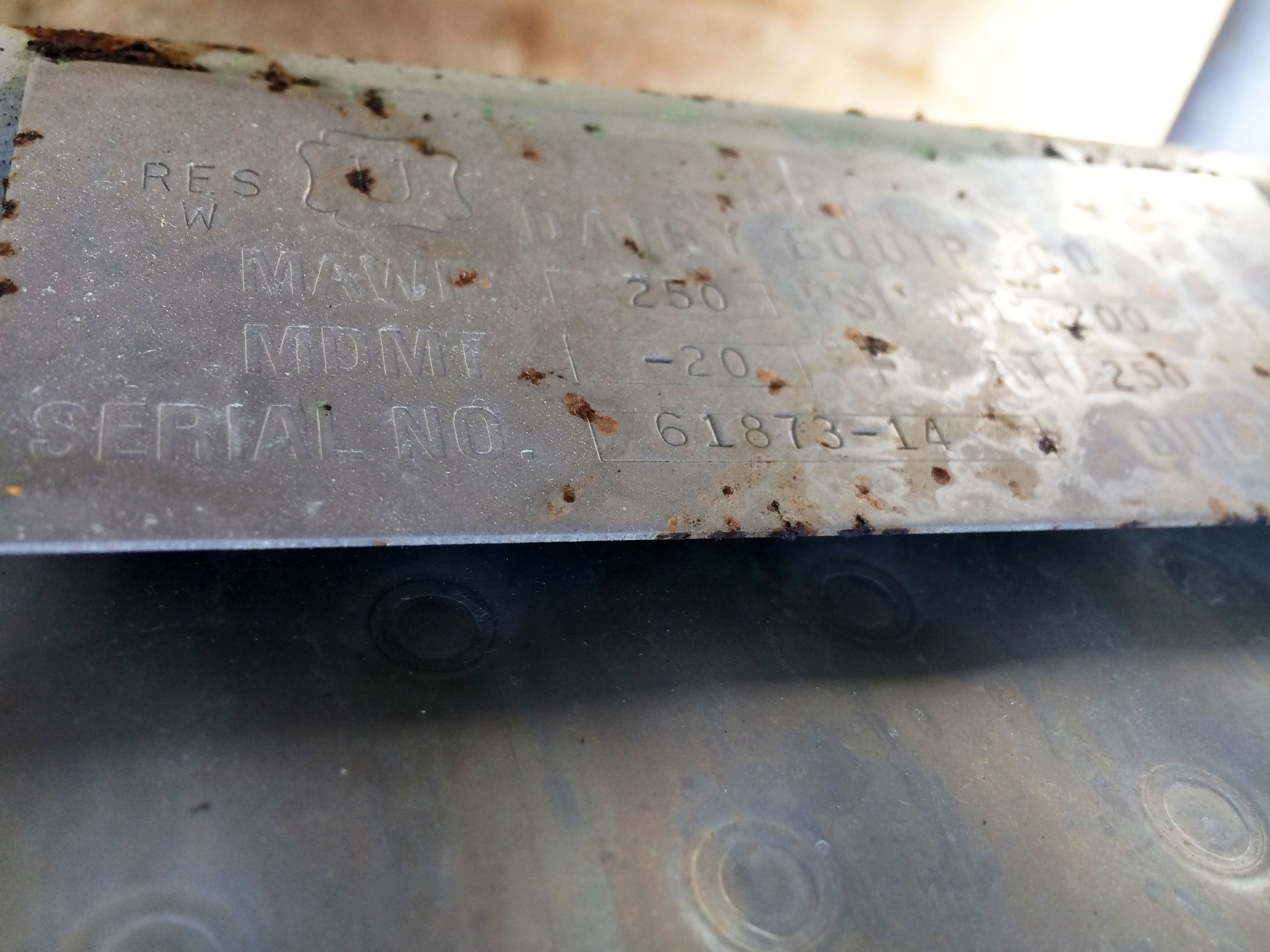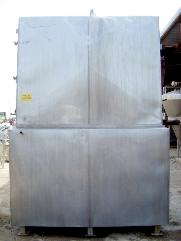 Dairy Equip. Co. Falling Film Plate Chiller. Certified by Dairy Equip., Co. Serial: 61873-14 and 61873-16. MAWP 250 PSI at 200F. MDMT -20F at 250 PSI. Year: 1989. Number of dimple plates: 4. Two nameplates are missing. Plate dimensions: 5 ft. 9 1/2 in. L. x 3 ft. 10 1/2 in. W. Collecting tank-800 gallons. Inside tank dimensions: 6 ft. 4-1/2 in. L. x 4 ft. 1 in. W. x 4 ft. 3-1/2 in. H. Inlets: (2) 3-1/2 in. dia. NPT fitting, (1) 2-1/2 in. dia. NPT fitting. Outlets: (1) 3-1/2 in. NPT fitting. Overall dimensions: 6 ft. 11 in. L. x 4 ft. 8 in. W. x 9 ft. 9 in. H. Note: Multiple leaks on plates.